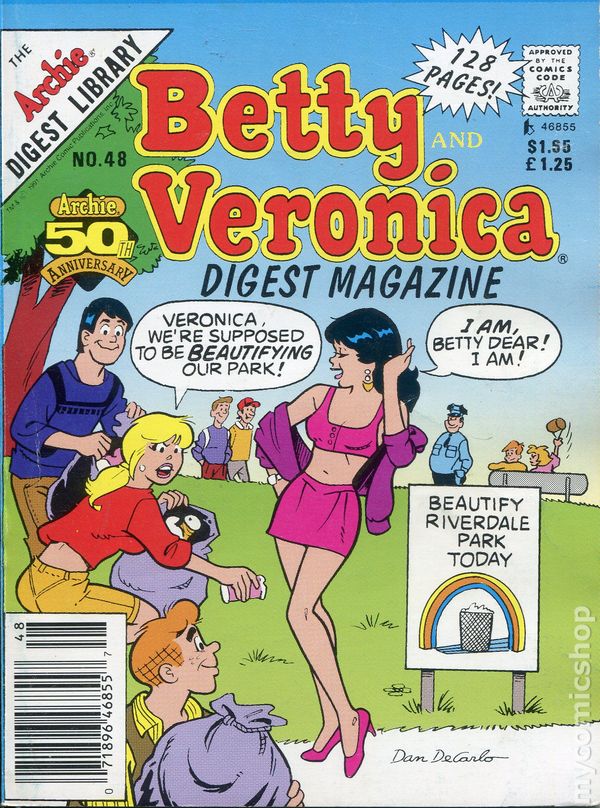 Cover by Dan DeCarlo. "As Easy As 12-26-83," script by Frank Doyle, pencils by Dan DeCarlo, inks by Alison Flood; Fed up with the boys eavesdropping on their conversations, Betty and Veronica develop a code to converse in. Statement of ownership; Total Paid Circulation, avg. 12 months: 57,970. Archie 50th Anniversary Calendar of Events ad. "Foreign Bombshell," script by Eve Nagler, pencils by Dan DeCarlo, inks by Alison Flood; Riverdale High gets a transfer student from France and Archie immediately makes a play for her. "Fitness Flop," script by Mike Pellowski, pencils by Dan DeCarlo, inks by Alison Flood; Famous bodybuilder Arnold Musclenager is coming to find aerobics models for his television show, and Betty and Veronica go all out to impress him. "Royal Pain," script by Frank Doyle, pencils by Dan DeCarlo, inks by Alison Flood; Veronica demands that Betty take Archie out so she'll be free to date "The Duke." 36 pgs., full color. Cover price $1.00.