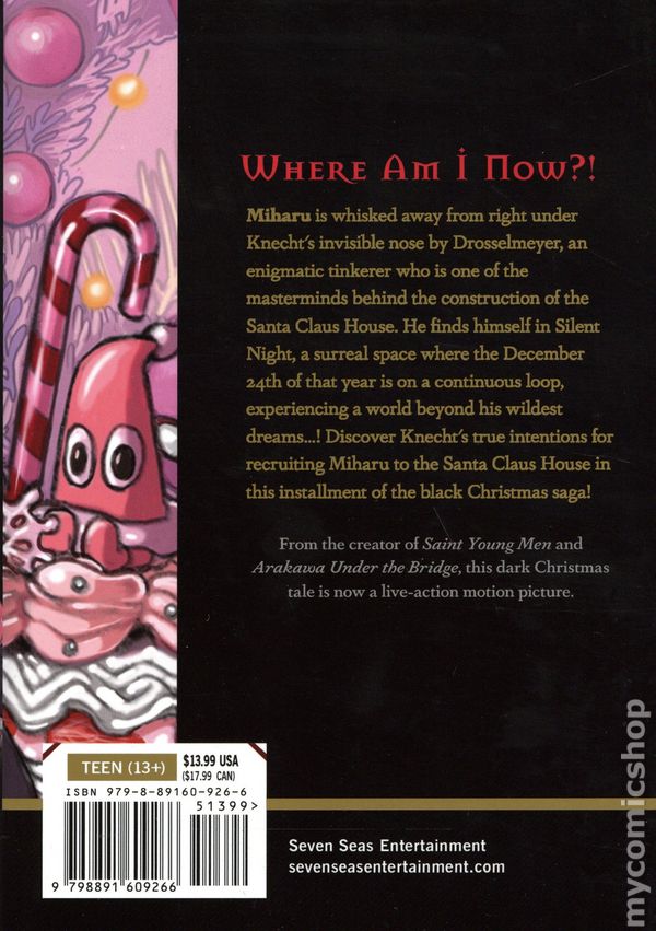 Volume 6 - 1st printing. Story and Art by Hikaru Nakamura. Translated by Richard Tobin. Miharu is whisked away from right under Knecht's invisible nose by Drosselmeyer, an enigmatic tinkerer who is one of the masterminds behind the construction of the Santa Claus House. He finds himself in Silent Night, a surreal space where the December 24th of that year is on a continuous loop, experiencing a world beyond his wildest dreams. Discover Knecht's true intentions for recruiting Miharu to the Santa Claus House! Softcover, 5-in. x 7-in., 178 pages, B&W. Teen (13+) Cover price $13.99.