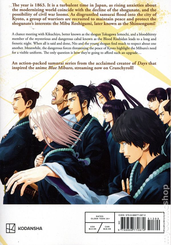 Volume 5 - 1st printing. Story and art by Tsuyoshi Yasuda. Translated by Stephen Paul. A chance meeting with Kikuchiyo, better known as Shogun Tokugawa Iemochi, and a bloodthirsty member of the mysterious and dangerous cabal known as the Blood Risshidan leads to a long and frenetic night. When all is said and done, Nio and the young Shogun find much to respect about one another. Meanwhile, the dangerous forces threatening the peace of Kyoto highlight the Miburo's need for a visible uniform. The only question is how they're going to afford such an upgrade... Softcover, 5 3/4-in. x 8 1/4-in., 208 pages, B&W. Older Teen 16+ Cover price $13.99.