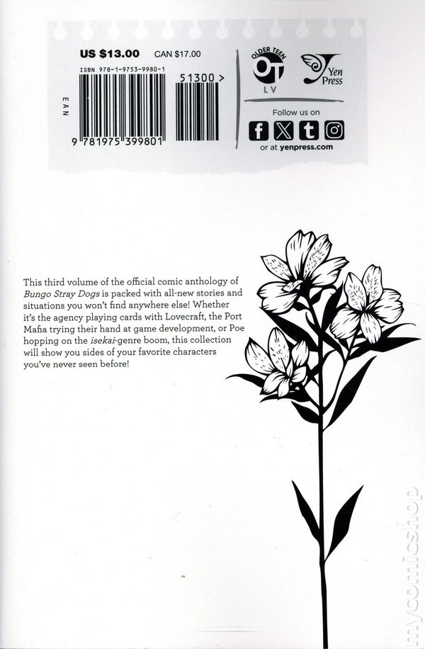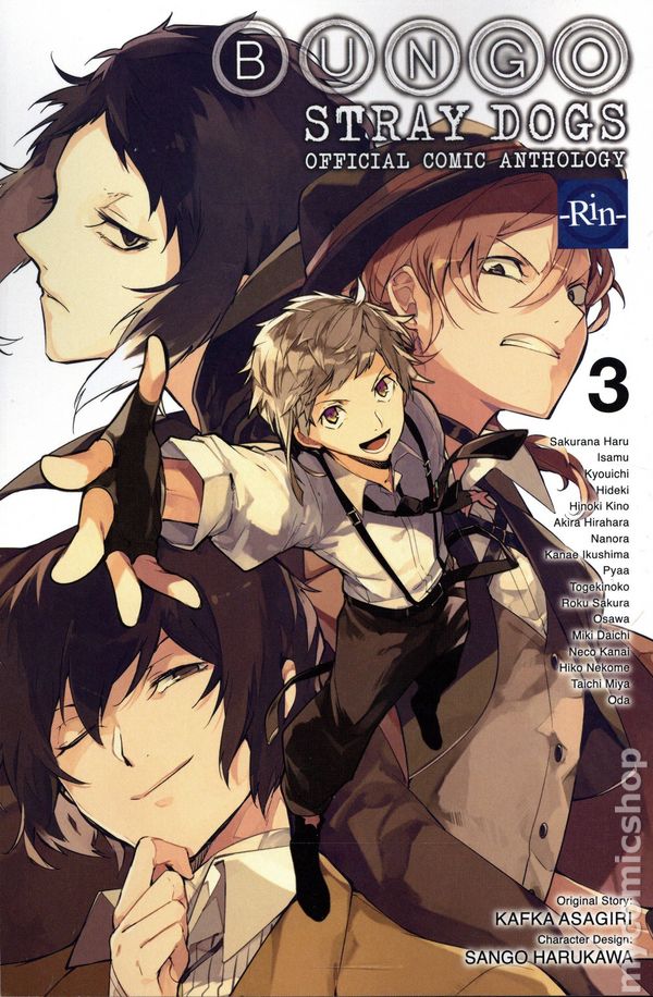 Volume 3 - 1st printing. Original Story by Kafka Asagiri. Character Design by Sango Harukawa. Translated by Kevin Gifford. This third volume of the official comic anthology of Bungo Stray Dogs is packed with all-new stories and situations you won't find anywhere else! Whether it's the Agency playing cards with Lovecraft, the Port Mafia trying their hand at game development, or Poe hopping on the isekai boom, this collection will show you sides of your favorite characters you've never seen before! Softcover, 5-in. x 7 1/2-in., 144 pages, B&W. Older Teen Cover price $13.00.
