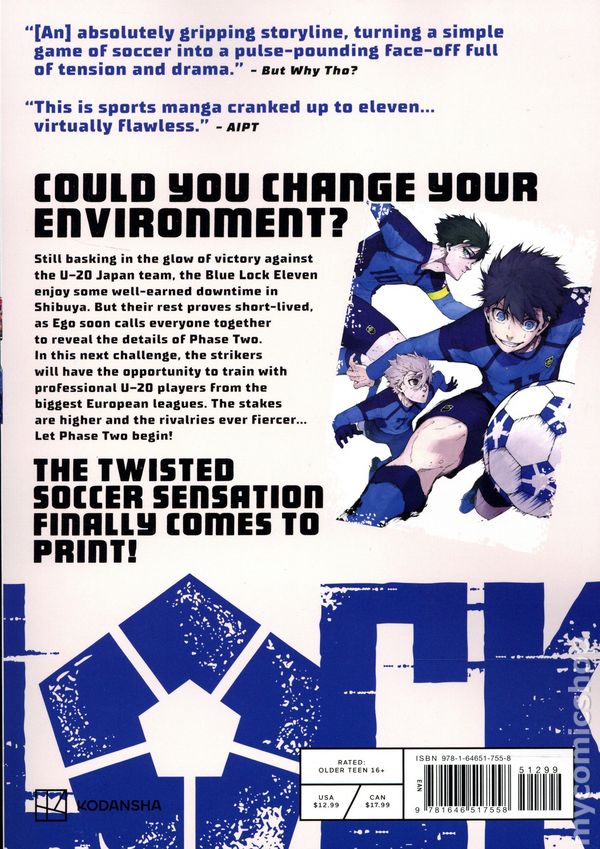 Volume 18 - 1st printing. Written by Muneyuki Kaneshiro. Art and cover by Yusuke Nomura. A mad young coach gathers soccer players from across the country to compete in a series of bizarre challenges in a high-tech colosseum he calls Blue Lock. It's a no-balls-barred battle to become Japan's next top striker, in this Squid Game–meets–World Cup manga, now available in print! Anime airing now! COULD YOU CHANGE YOUR ENVIRONMENT? Still basking in their victory against the U-20 Japan team, the Blue Lock Eleven enjoy some well-earned downtime in Shibuya. But their rest proves short-lived, as Ego soon calls everyone together to reveal the details of Phase Two. In this next challenge, the strikers will have the opportunity to train with professional U-20 players from the biggest European leagues. The stakes are higher and the rivalries ever fiercer... Let Phase Two begin! Softcover, 5 1/2-in. x 8-in., 208 pages, B&W. Older Teen 16+ Cover price $12.99.
