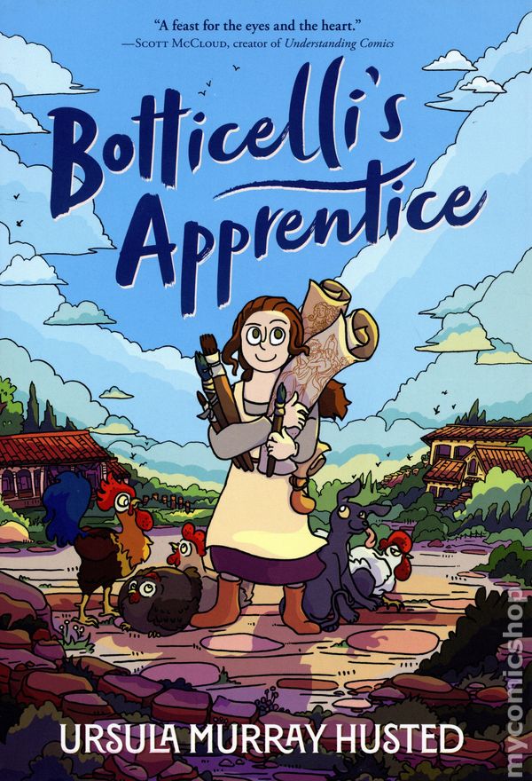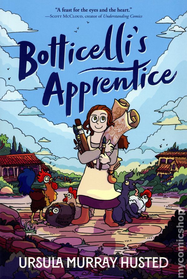 1st printing. Story and art by Ursula Murray Husted. A funny, empowering graphic novel set in Renaissance Italy, following an ambitious young girl's quest to become an apprentice to the famous Sandro Botticelli. Life as a chicken girl isn't so bad, but Mella wants more. Though girls can't be official apprentices to artists in Florence, Mella has been secretly teaching herself to paint while tending to artist Sandro Botticelli's chickens. When one of Botticelli's actual apprentices discovers Mella's work, he threatens to take full credit for it. Why does it matter who drew it, if it's good? With the help of unexpected allies, an important patron, and a tenacious stray dog named Blue, Mella must summon all her courage, smarts, and skills to prove her worth and demand the recognition she deserves. Softcover, 6-in. x 9-in., 272 pages, full color. Cover price $15.99.