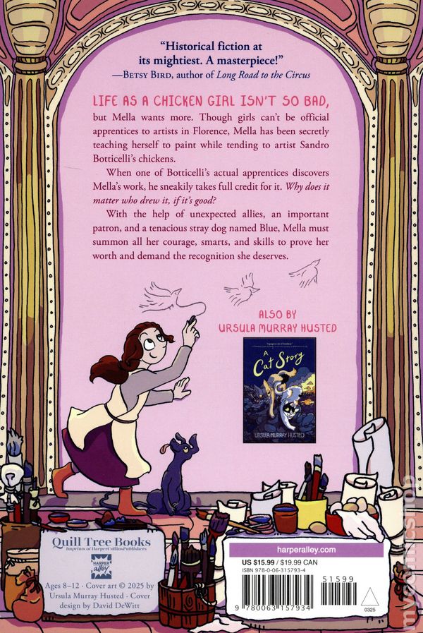 1st printing. Story and art by Ursula Murray Husted. A funny, empowering graphic novel set in Renaissance Italy, following an ambitious young girl's quest to become an apprentice to the famous Sandro Botticelli. Life as a chicken girl isn't so bad, but Mella wants more. Though girls can't be official apprentices to artists in Florence, Mella has been secretly teaching herself to paint while tending to artist Sandro Botticelli's chickens. When one of Botticelli's actual apprentices discovers Mella's work, he threatens to take full credit for it. Why does it matter who drew it, if it's good? With the help of unexpected allies, an important patron, and a tenacious stray dog named Blue, Mella must summon all her courage, smarts, and skills to prove her worth and demand the recognition she deserves. Hardcover, 6-in. x 9-in., 272 pages, full color. Cover price $24.99.