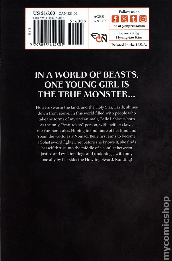 Volume 1 - 1st printing. "The Girl of Reason!" Written by Tow Ubukata. Cover by Hyung-Tae Kim. Translated by Roman Lempert. Belle lives in a world where people take the forms of animals like cats, frogs, and mice-and she's the odd one out! This peculiar fang-less, fur-less, scale-less, smooth-skinned girl sets off on a journey to find others like her. However, in order to travel freely, she'll have to wield her Howling Sword and prove herself in battle! Softcover, 5-in. x 7-in., 288 pages Text Only. Ages 13 & Up Cover price $16.00.