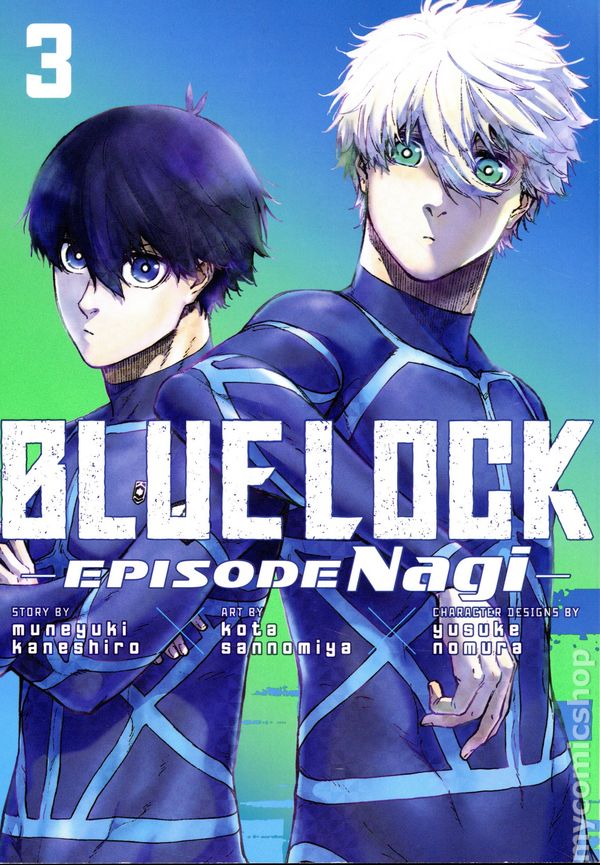 Volume 3 - 2nd and later printings. Written by Muneyuki Kaneshiro. Art and cover by Kota Sannomiya. Character Designed by Yusuke Nomura. The new prequel manga to the smash-hit soccer action series Blue Lock! How does a listless slacker who thinks everything's a huge pain turn into one of Japan's top scorers? Find out, as high schooler Reo Mikage sets out to fan the flames of ambition in future soccer prodigy Seishiro Nagi, in Blue Lock: Episode Nagi. Anime movie coming soon! THE FIRE WITHIN - Thanks to the triple threat of Nagi, Reo, and Zantetsu, Team V has breezed through each round of the First Selection. That is, until they come up against Team Z and Yoichi Isagi. Isagis passion for the game suddenly has Nagi questioning everything: What makes him push himself so hard? What does soccer mean to him? Why not just give up? Farewell ennui, hello ego... Its time for the slacker to finally awaken! Softcover, 5 3/4-in. x 8 1/4-in., 208 pages, B&W. Older Teen 16+ Cover price $13.99.