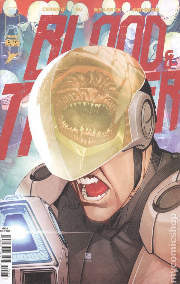 2nd Printing. Cover B. Written by Benito Cereno. Art and Cover by E.J. Su, Msassyk. SERIES PREMIERE Bounty hunter Akeldama Blood Bledsoe and her cantankerous talking gun Thunder are the best out there at bringing in the bad guys. However, when the galaxys most dangerous criminal breaks out of prison, Bloods hunt delivers her down a path that will unlock secrets about her past, present, and future...and thats when things get REALLY BAD. The team of BENITO CERENO, E.J. SU (TECH JACKET), and MICHELE MSASSYK ASSARASAKORN, in partnership with visionary creator** ROBERT KIRKMAN** (INVINCIBLE, THE WALKING DEAD), present an all-new action epic set in the near future where Earth has integrated alien species into a new society—meaning theres a whole new set of rules...and a whole load of new crimes to solve. 28 pages, full color. Rated M Cover price $3.99.