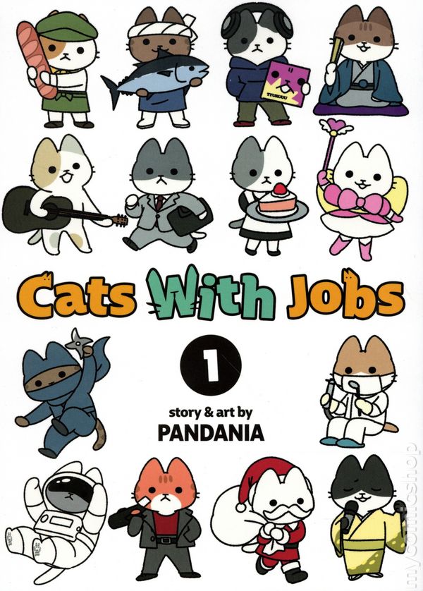 1st printing. Story and art by PANDANIA. Translated by Minna Lin. Where there's a job, there's a cat ready to work in this adorable new series from the creator of The Evil Secret Society of Cats, Yokai Cats, and Monster Cats!Ever wondered what it would be like if your cat had to get a job? The cats in this book do every kind of occupation you can imagine, and they do it just the way they like. Feline chefs, dentists, wrestlers, detectives, opera singers and much more await in this hilarious full-color collection! Also includes a set of stickers featuring some of the working cats! Softcover, 6-in. x 8 1/4-in., 144 pages, B&W. Ages 10+ Cover price $14.99.