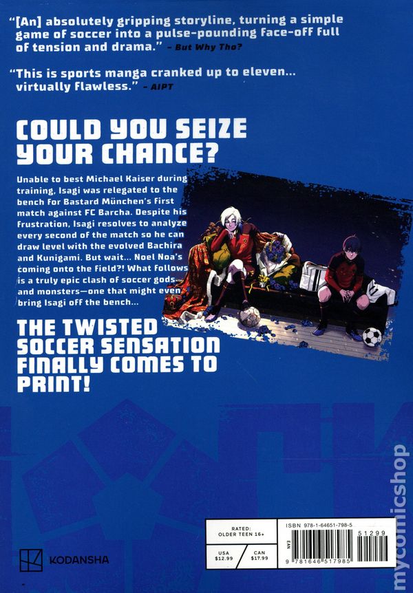 Volume 19 - 1st printing. Written by Muneyuki Kaneshiro. Art and cover by Yusuke Nomura. Unable to best Michael Kaiser during training, Isagi was relegated to the bench for Bastard München's first match against FC Barcha. Despite his frustration, Isagi resolves to analyze every second of the match so he can draw level with the evolved Bachira and Kunigami. But wait... Noel Noa's coming onto the field?! What follows is a truly epic clash of soccer gods and monsters-one that might even bring Isagi off the bench... Softcover, 5 1/2-in. x 8-in., 208 pages, B&W. Older Teen 16+ Cover price $12.99.