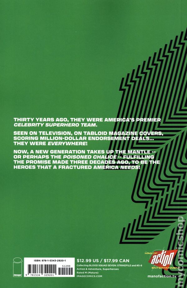Volume 2 - 1st printing. "Con Season!" Collects Blood Squad Seven Strikefile (2024 Image) and Blood Squad Seven (2024 Image) #5-8. Written by Joe Casey. Art and Cover by Paul Fry. More secrets are revealed in this second volume of celebrity superheroic splendor! This ones got it all: The tragic fate of Man of War! The very first Blood Con! The villainous new Gang of Four! Guest appearances by ERIK LARSENs SuperPatriot, JIM VALENTINOs Shadowhawk, and much more! Softcover, 152 pages, full color. Mature Readers Cover price $12.99.