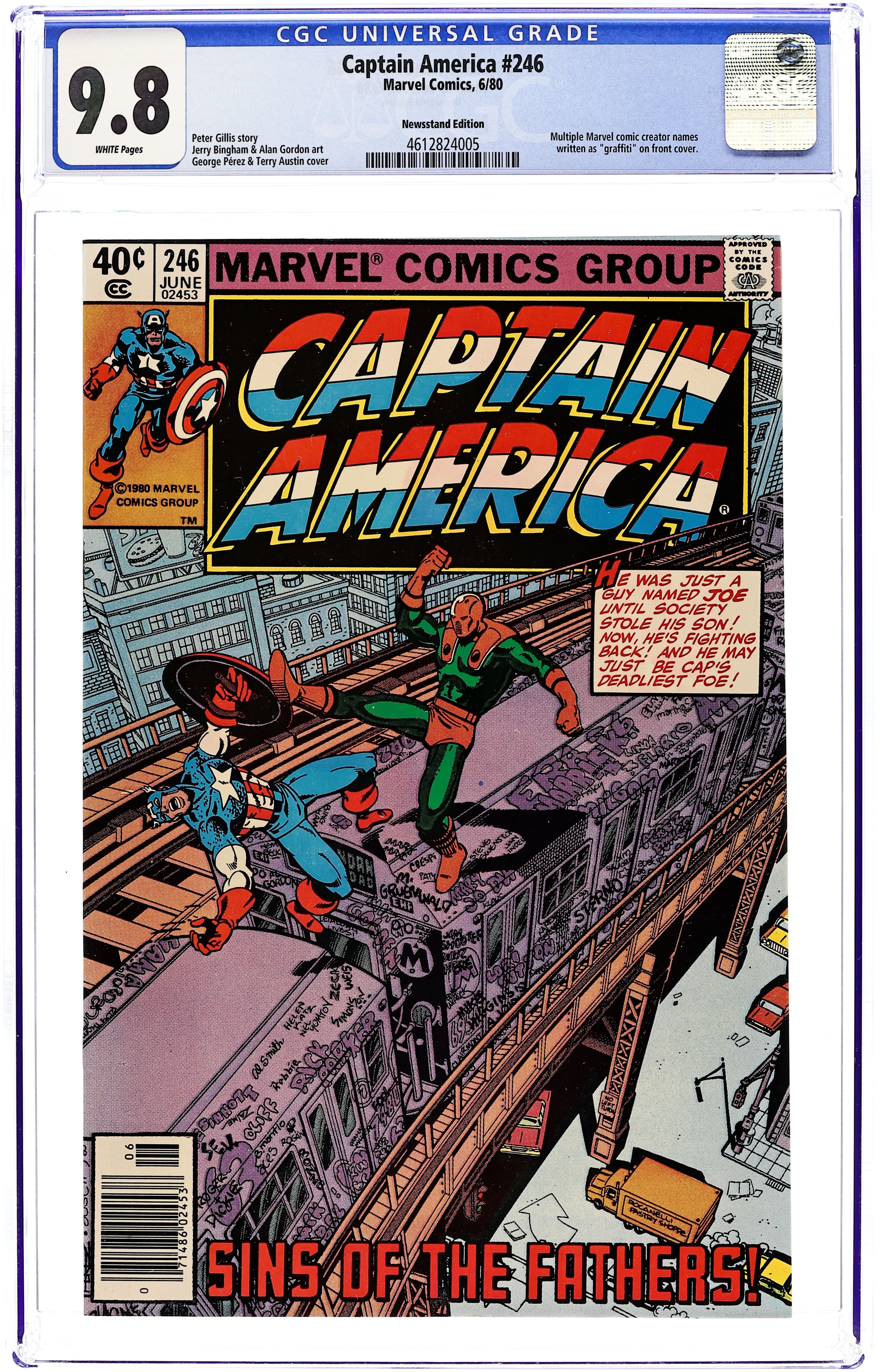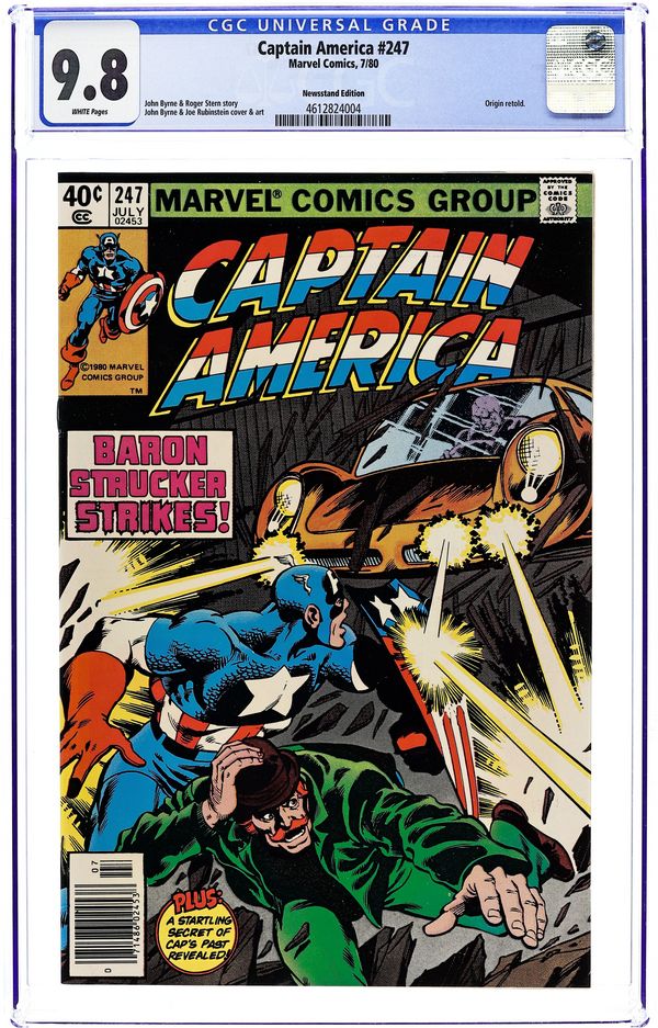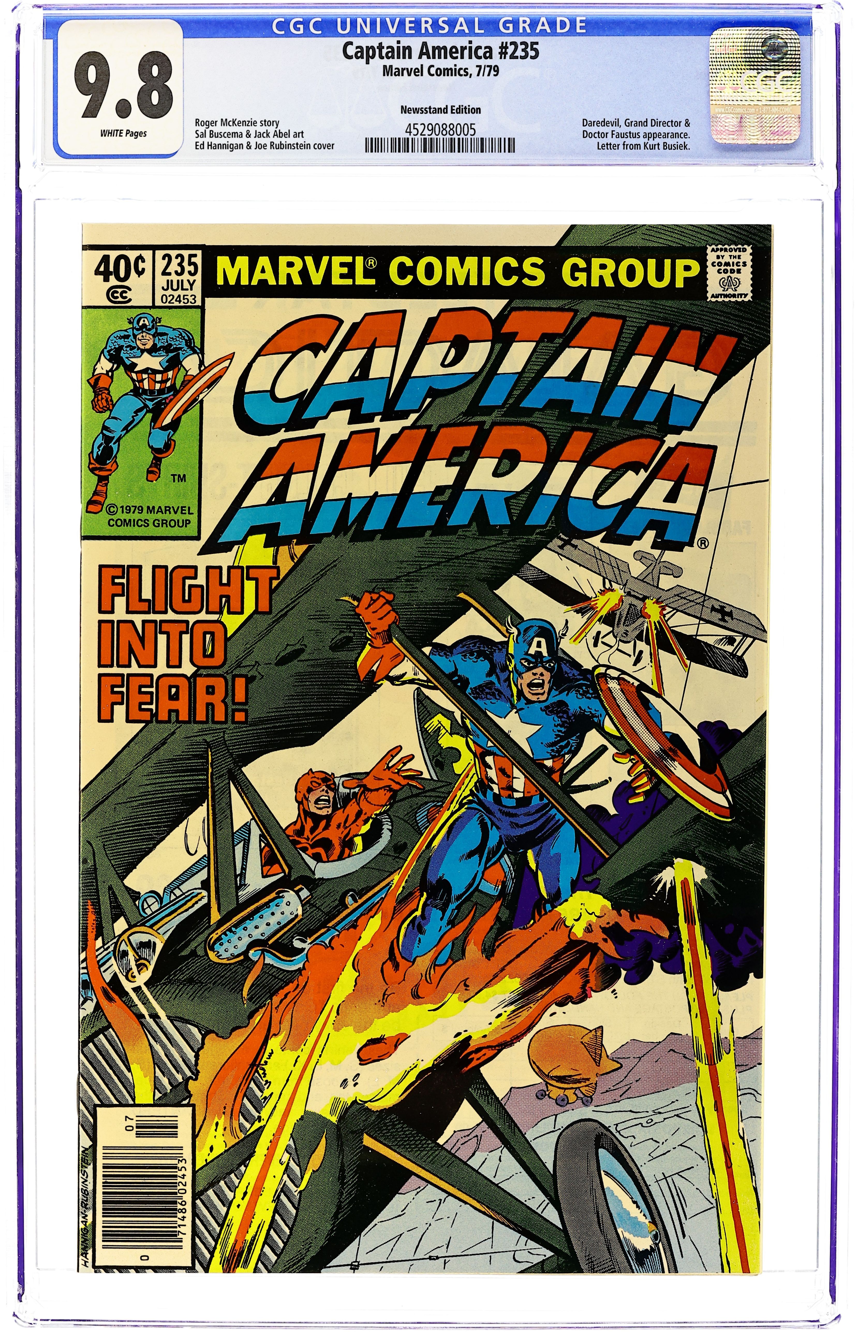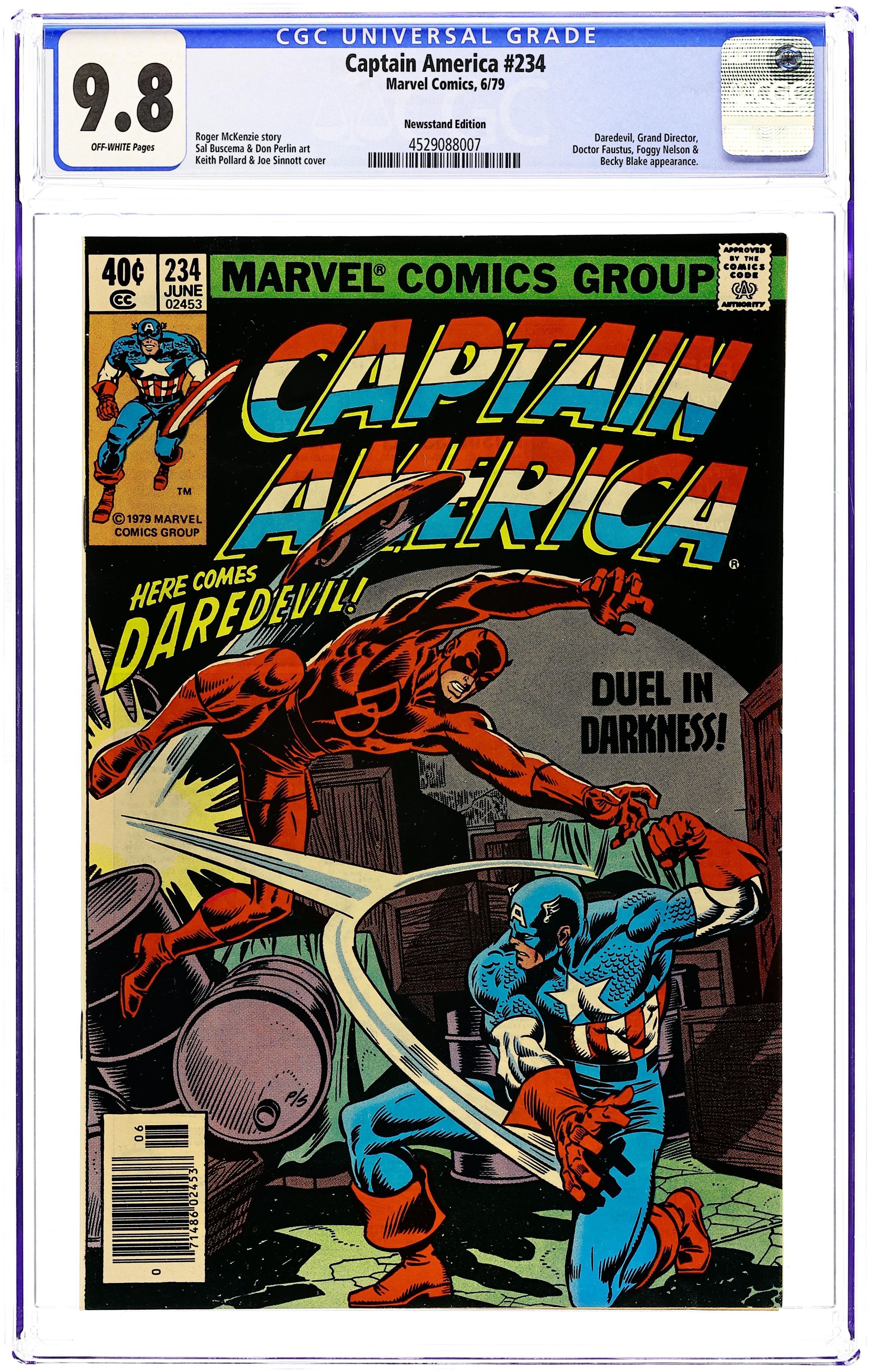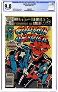 Newsstand Edition. "Blockbuster!" Plot by Chris Claremont. Script by Chris Claremont (pp. 1-12) and David Michelinie (pp. 13-22). Art by Mike Zeck. Cover by Mike Zeck. Steve Rogers and Bernie Rosenthal's date is interrupted by an arsonist...who sets the residential building across the street ablaze! The Sentinel of Liberty is almost killed while trying to help all the tenants escape. And he vows to capture the deadly fire starter known as Blockbuster! (Note: This issue begins Mike Zeck's 3-year run as the penciler of the Captain America title.) 36 pages. Cover price $0.50.