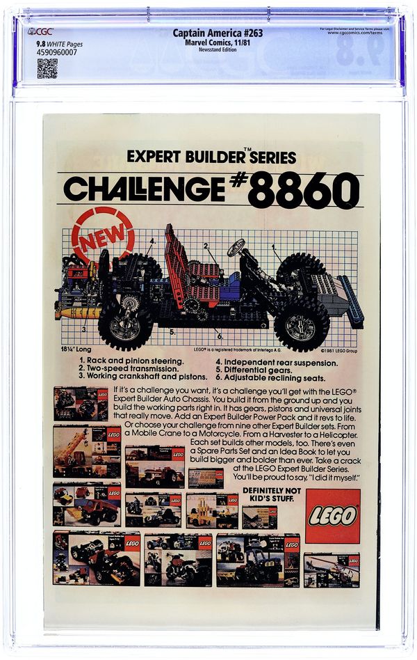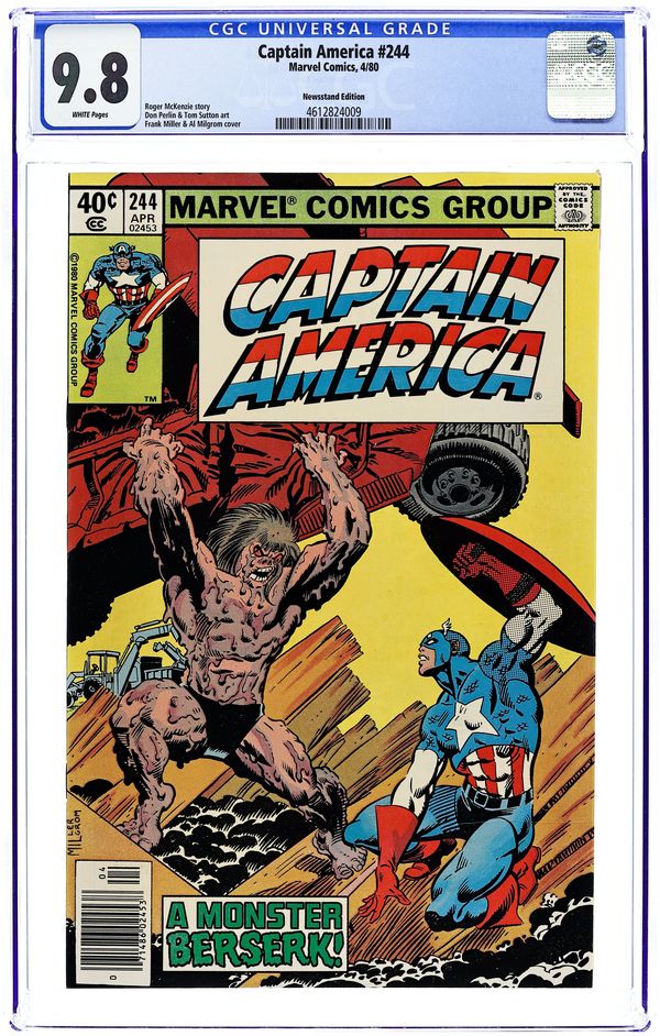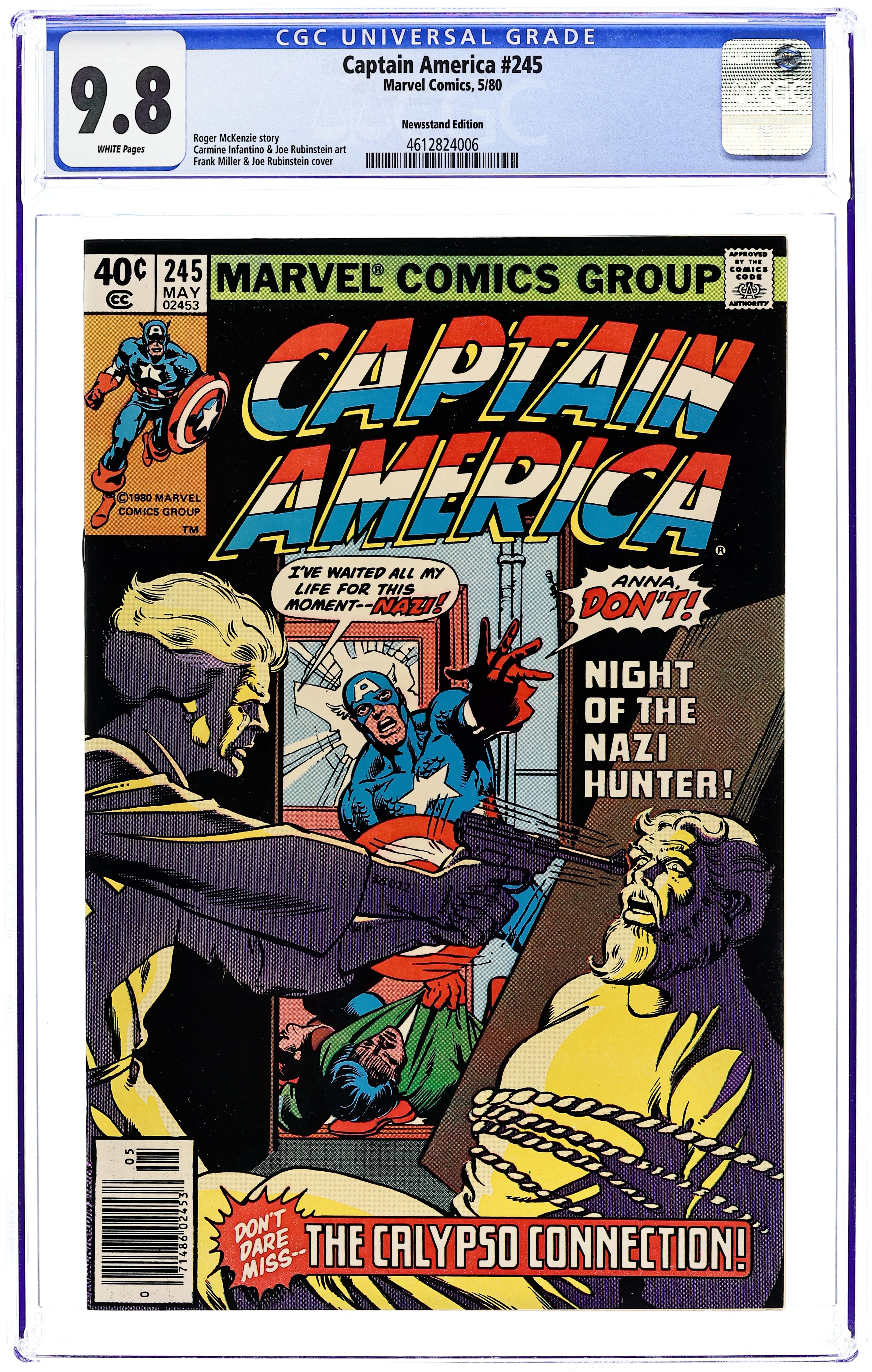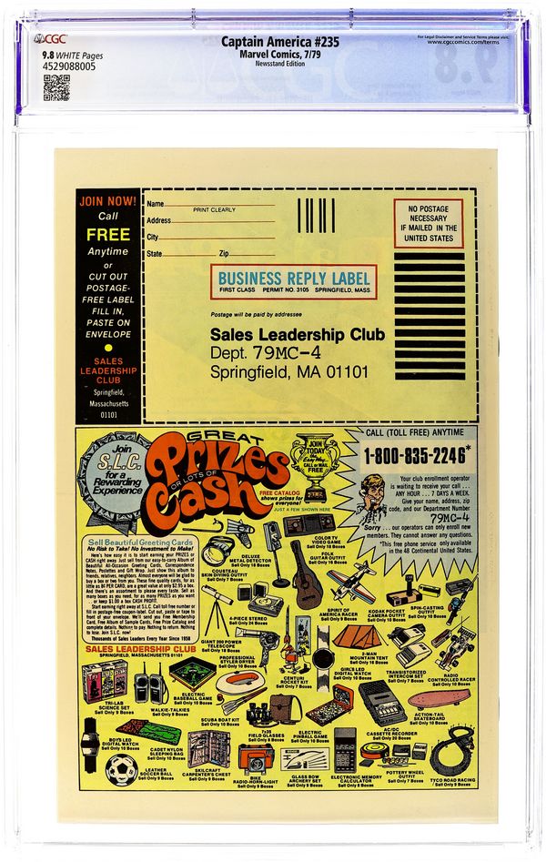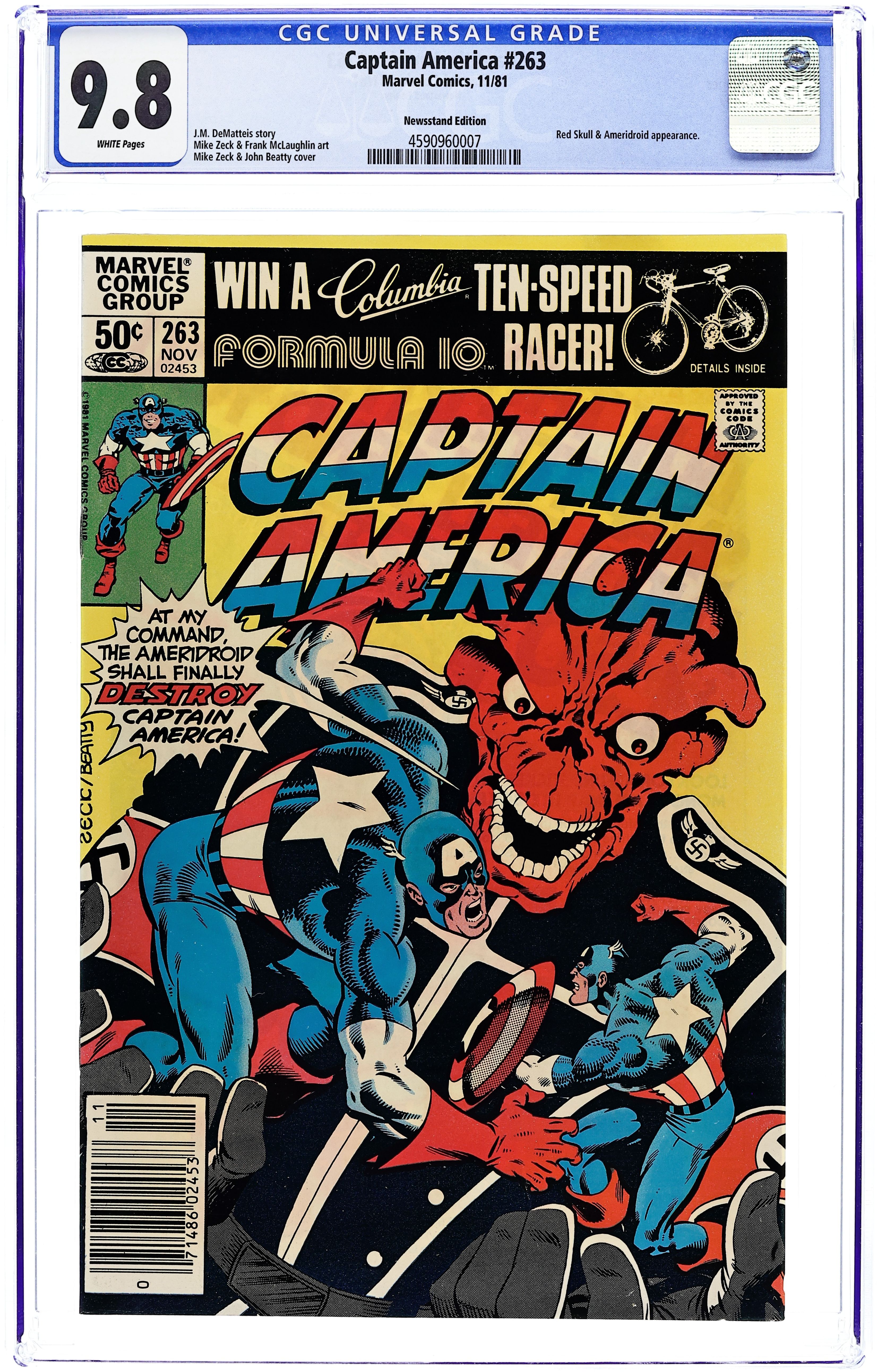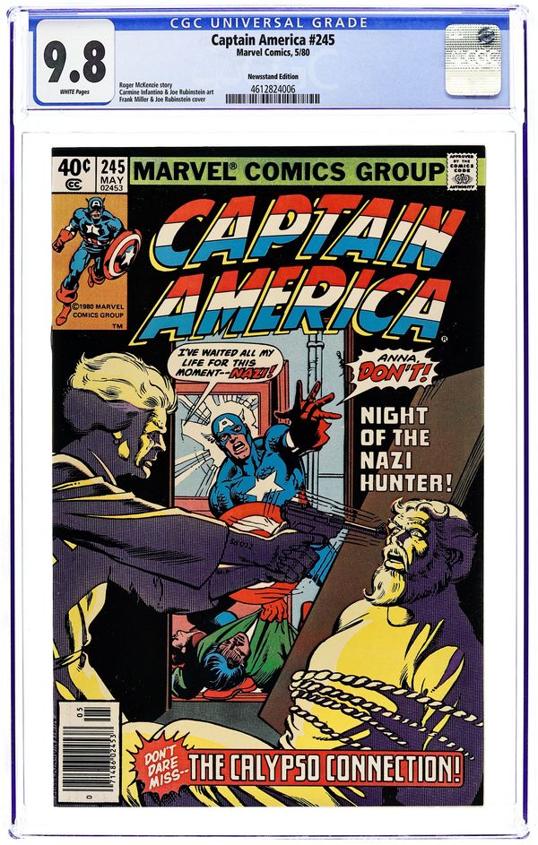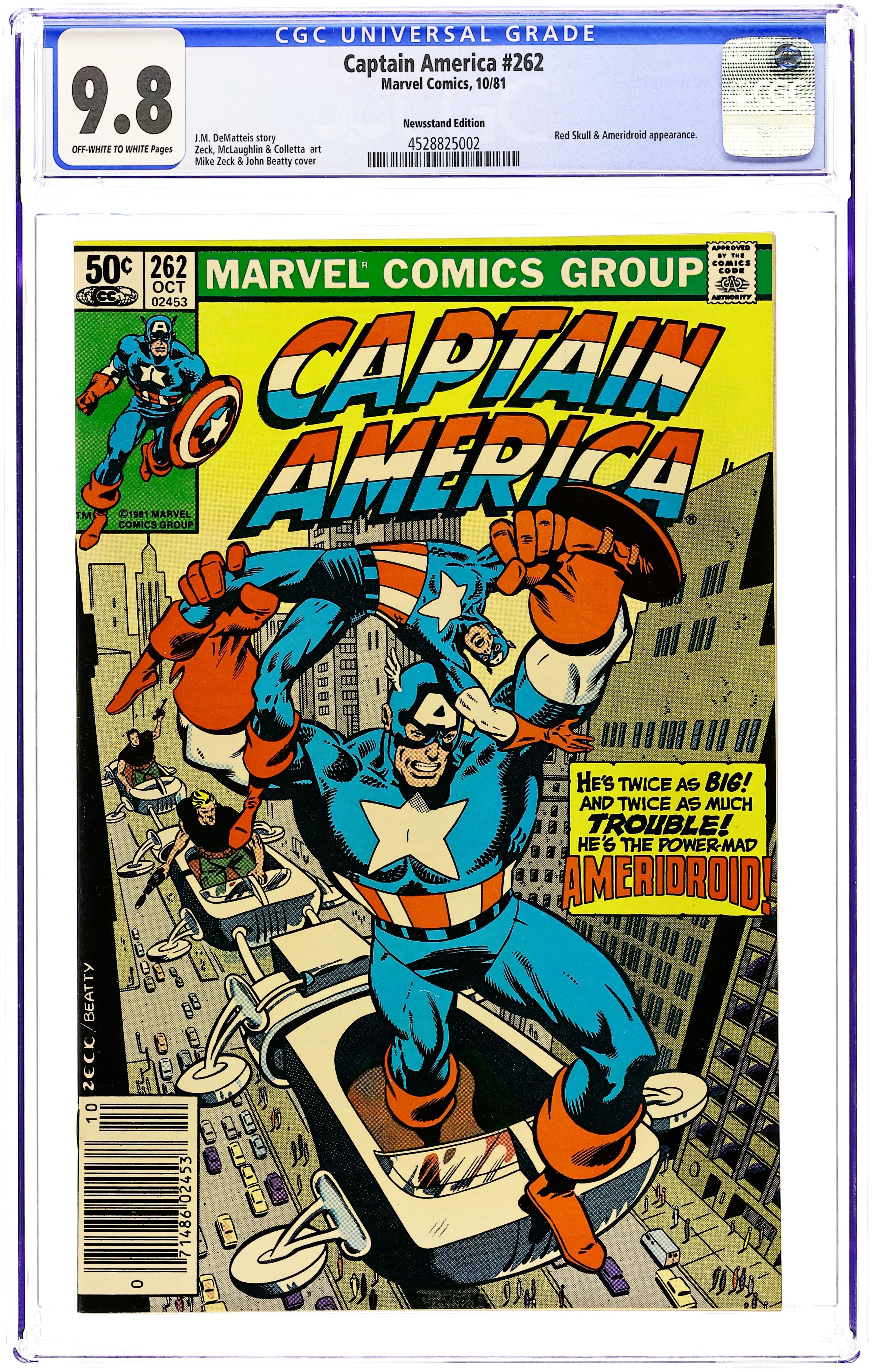 Newsstand Edition. "Death of a Legend?" Part 2 of 3. Script by J.M. DeMatteis. Pencils by Mike Zeck. Inks by Frank McLaughlin. Cover by Mike Zeck and John Beatty. While Cap is in Los Angeles looking for the imposter who is masquerading as Nomad, a shadowy group called the Nihilist Order terrorizes the city. Is there a connection between the phony Nomad (aka Eddie Ferbel) and the Nihilist Order? The star-spangled avenger thinks so! When the city of Los Angeles hosts the Captain America Day Parade, the Nihilist Order strikes again -- with a big new ally: the Ameridroid! The 12-foot android knocks out Nomad and then captures the Living Legend! Just like the Red Skull planned! (Note: Cap previously fought the Ameridroid in Captain America 221.) 36 pages. Cover price $0.50.