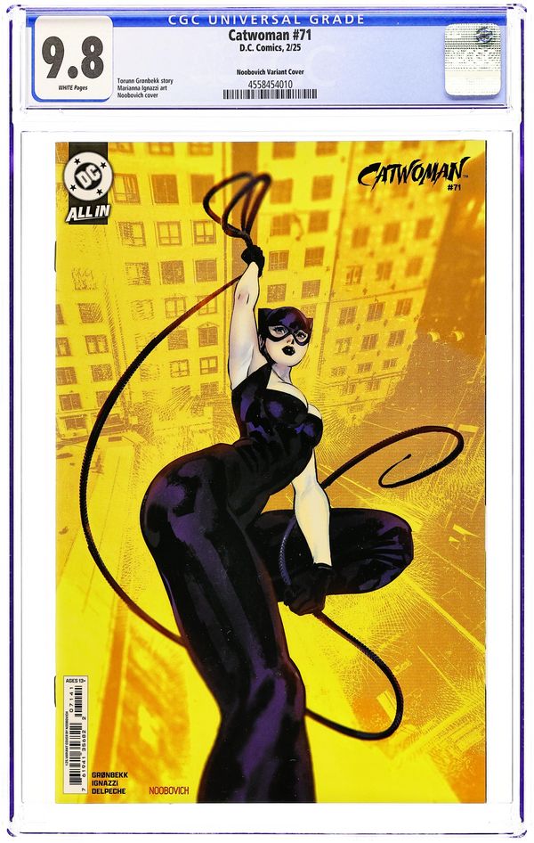 Limited 1 for 25 Retailer Incentive Variant Cover. Written by Torunn Gronbekk. Art by Marianna Ignazzi. Cover by Noobovich. WHAT'S ONE CATWOMAN BETWEEN GOOD FRIENDS? Selina's international hunt brings her to Stockholm in search of an old acquaintance who has become a crime lord there... Of course, she's pretty sure he might be the one who's put a price on her head, so she's going to need to sneak in if she wants to get answers. Luckily for this cat, there's a fancy-dress party that's the perfect opportunity to slink in unnoticed. 32 pages, full color. Rated T+ Cover price $4.99.