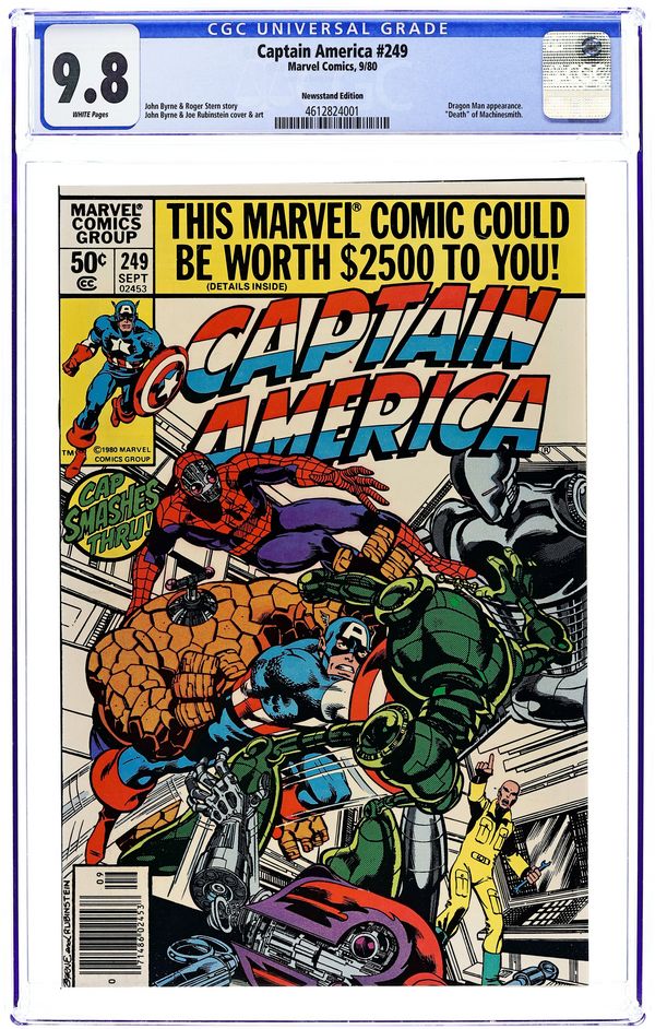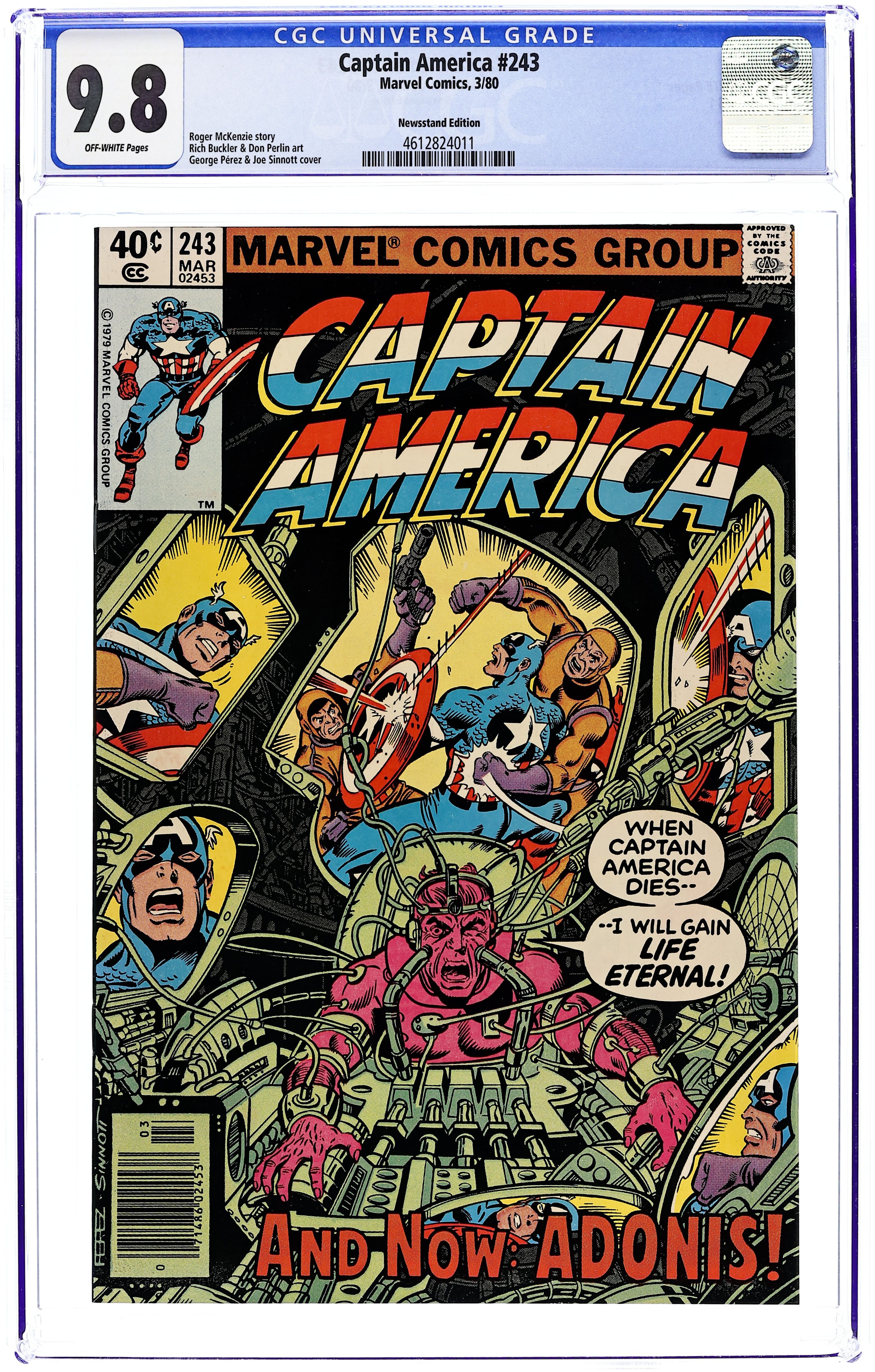 Newsstand Edition. "The Last Movie!" Part 3 of 3. Script by J.M. DeMatteis. Pencils by Mike Zeck. Inks by Frank McLaughlin and Vince Colletta. Cover by Mike Zeck and John Beatty. The sinister plan of the Red Skull stands revealed! The Third Reich's top terror operative has lured the star-spangled avenger to California to make a movie -- about the death of Captain America! And the final scene is Steve Rogers' actual death -- at the hands of the Ameridroid! Can the Living Legend rewrite the script and change the ending? And perhaps more importantly halt the release of the Red Skull's film? Final appearance of Edward Ferbel. 36 pages. Cover price $0.50.