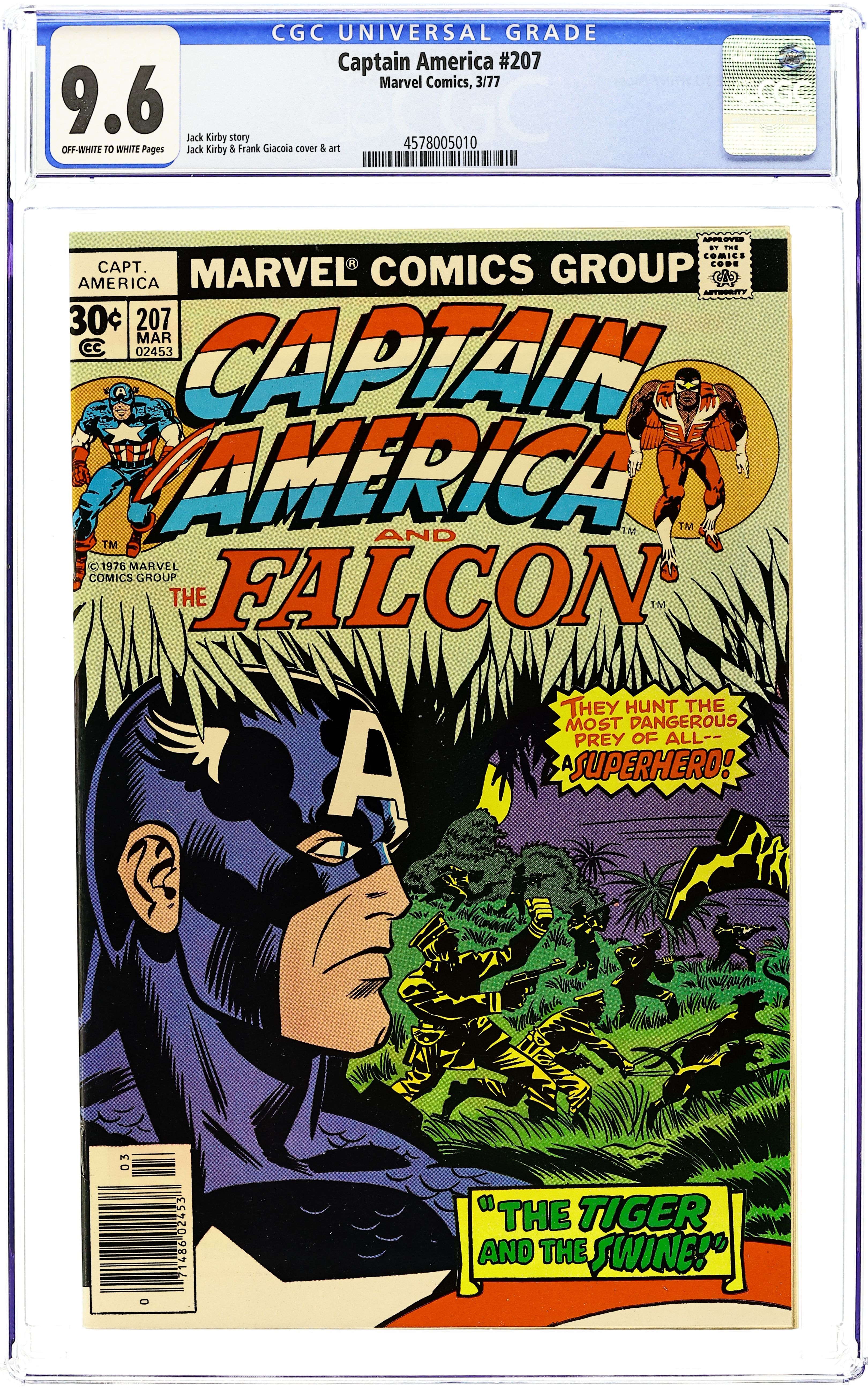 "The Trojan Horde" Part 2 of 8. Script by Jack Kirby. Pencils by Jack Kirby. Inks by Frank Giacoia. Cover by Jack Kirby and John Verpoorten. The search for the Madbomb begins! The U.S. government sends Captain America and the Falcon into a remote wilderness area near the Badlands --that could be the secret location of the Madbomb! But in truth the government has unknowingly sent the pair into the clutches of the Royalist Forces of America! Who are they? The Sentinel of Liberty doesn't know, but he quickly learns that the shadowy group is performing gruesome experiments on its captives! Will Cap and the Falcon be the next to go under the knife? First (cameo) appearance of William Malcolm Taurey. (Notes: The letters page includes a letter from Fantagraphics publisher Kim Thompson. The letters page also contains Marvel Value Stamp series B #27 (Dracula). The Madbomb saga was reprinted in 2004 in trade paperback: Captain America and the Falcon Madbomb. The TPB collets issues 193 thru 200.) 36 pages. Cover price $0.25.