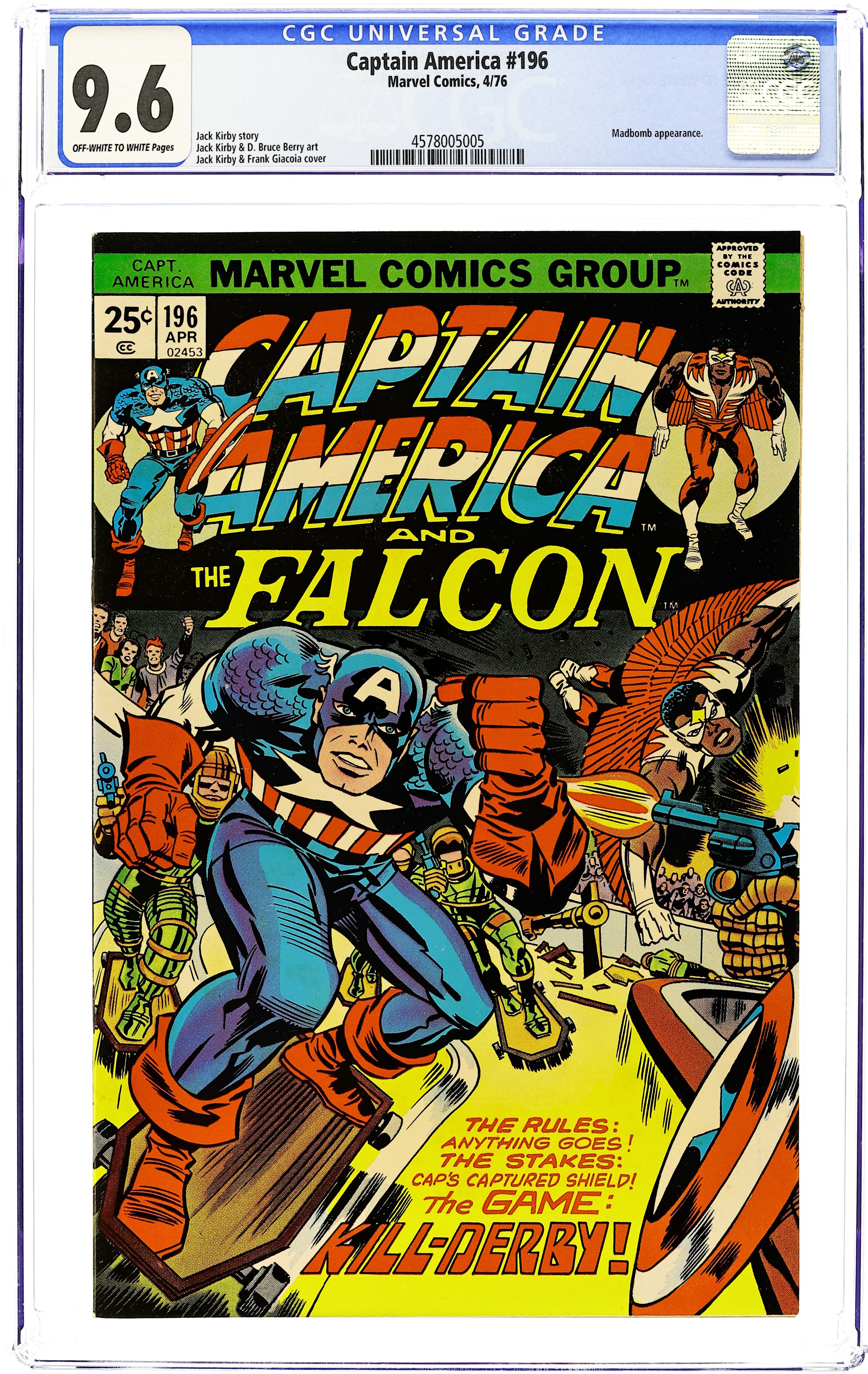 "Kill-Derby" Part 4 of 8. Script by Jack Kirby. Pencils by Jack Kirby. Inks by D. Bruce Berry. Cover by Jack Kirby and Frank Giacoia. The crafty Cheer Chadwick enters Cap and the Falcon into the death derby! Both heroes are assigned to the red team (along with Tinkerbelle). And they must slay the blue team in order to win! The star-spangled avenger doesn't have his shield at his side, but he does have a cool skateboard! When the derby begins, the fighting is intense! Cap plows through several members of the blue team and then spots the combatant holding his shield. The Living Legend will go for broke to get it back! In the meantime, elsewhere in the Badlands, the U.S. Army is frantically searching for the Royalist Forces of America's underground base. Cameo appearance by General Argyle Fist. (Note: The letters page includes a letter from comics publisher Dean Mullaney. The letters page also contains a statement of ownership: average print run 339,484; average paid circulation 180,156. There exists a 30-cent cover price variant for this issue.) 36 pages. Cover price $0.25.