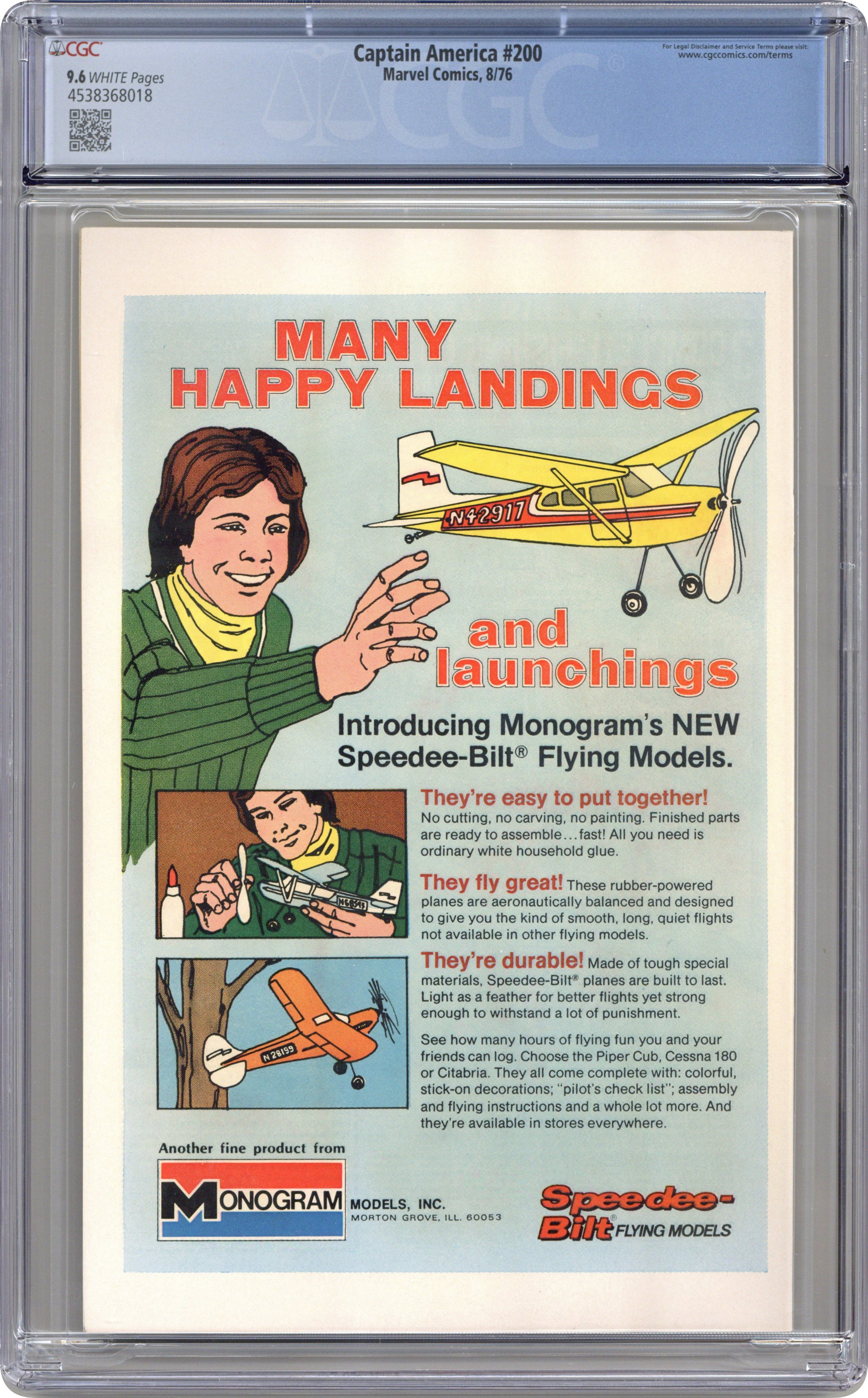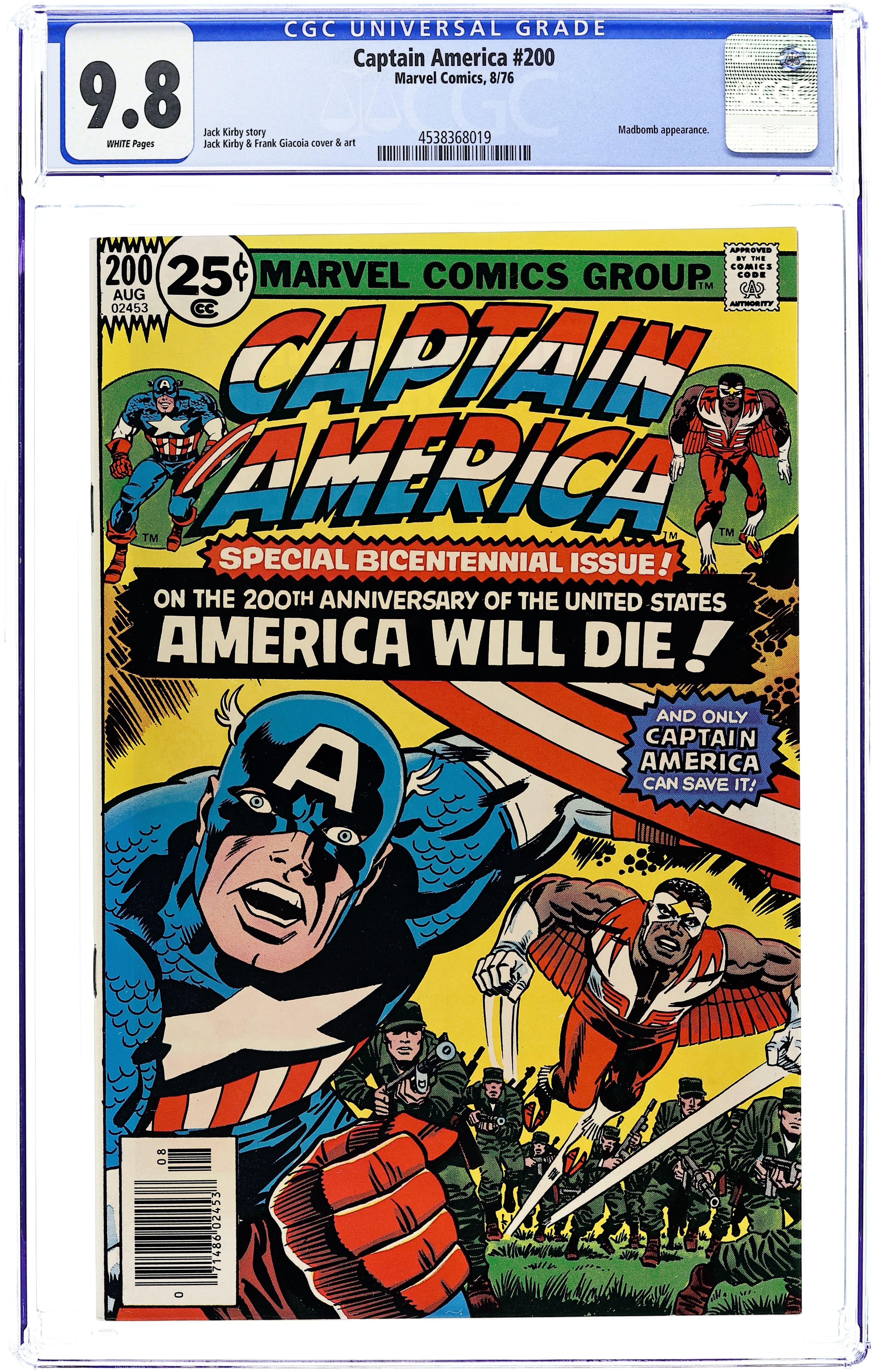 "Dawn's Early Light!" Part 8 of 8. Script by Jack Kirby. Pencils by Jack Kirby. Inks by Frank Giacoia. Cover by Jack Kirby and Frank Giacoia. It's the 200th anniversary of the United States of America! And the 200th issue of the Captain America title! But if the U.S.A. and the star-spangled avenger are going to survive beyond their bicentennials, the Royalist Forces of America and the "Big Daddy" Madbomb must be stopped! The Sentinel of Liberty and the Falcon launch a bold two-pronged attack to save the country! Cap leads a small assault team onto William Taurey's estate to capture the leader of the Elite. While in Philadelphia, the Falcon and a SHIELD strike force attempt to destroy the Madbomb! Can Cap and the Falcon score a double victory...and save the day for the red, white, and blue? Light the fireworks! The nation will stand! Last 25-cent cover price. (Notes: William Taurey and the Elite return years later in Thunderbolts #31. There exists a 30-cent cover price variant for this issue.) 36 pages. Cover price $0.25.