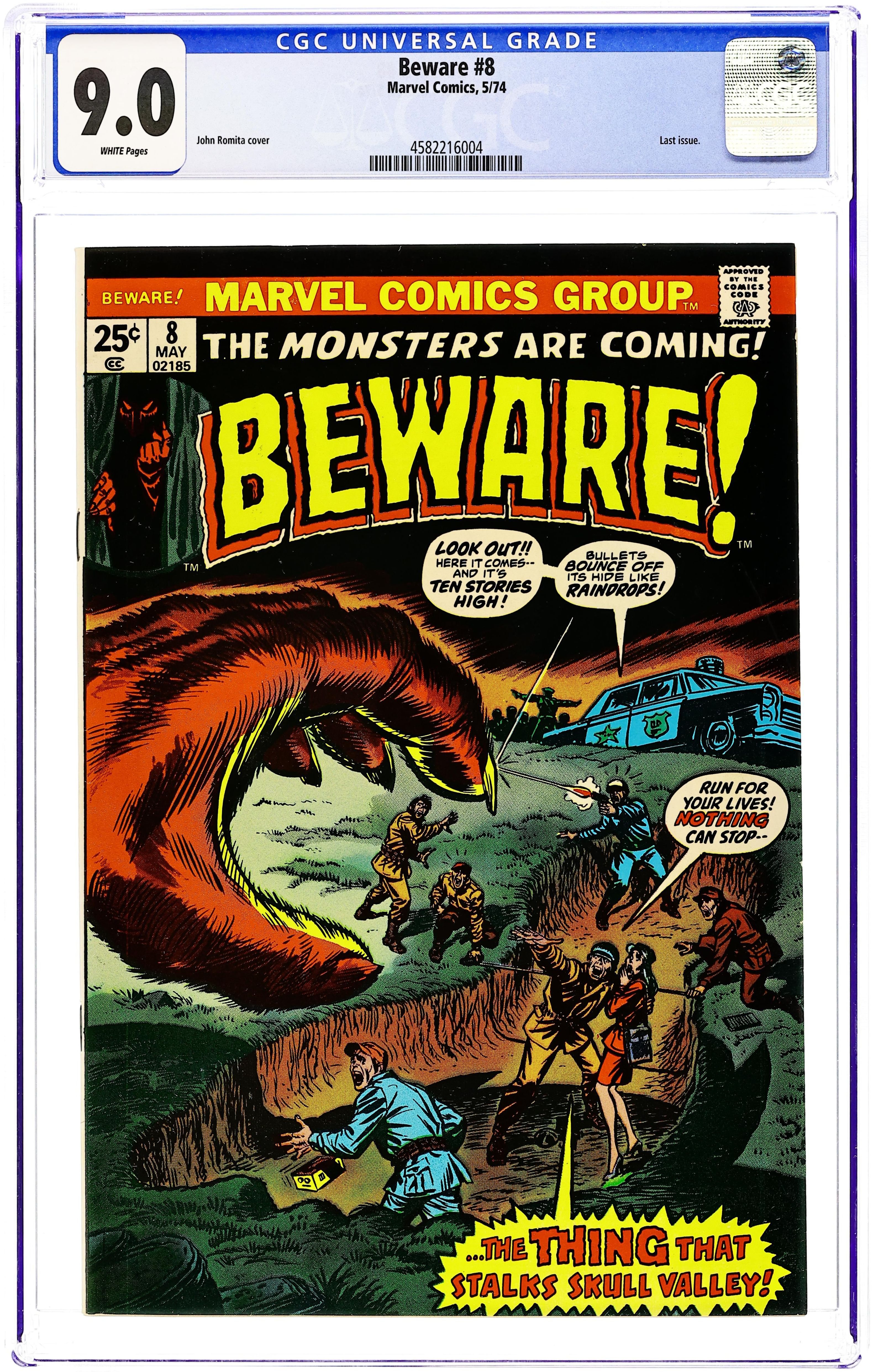 Final issue of the series (title continues as Tomb of Darkness). "The Helping Hand!" (from Marvel Tales 129); "The Black Dungeon" (from Mystic 2); "The Thing That Stalks Skull Valley!" (from Mystic 37); and "They Walk Thru Walls!" with art by Paul Reinman (from Astonishing Tales 56). Cover by John Romita. Stories by Ed Winiarski, Mike Sekowsky, Mort Lawrence, and Paul Reinman. Beware of these fear-filled suspense stories fill with action, intrigue and, best of all, monsters! All reprints from Marvel Tales, Mystic, and Astonishing. 36 pages, full color. $0.20. Cover price $0.25.
