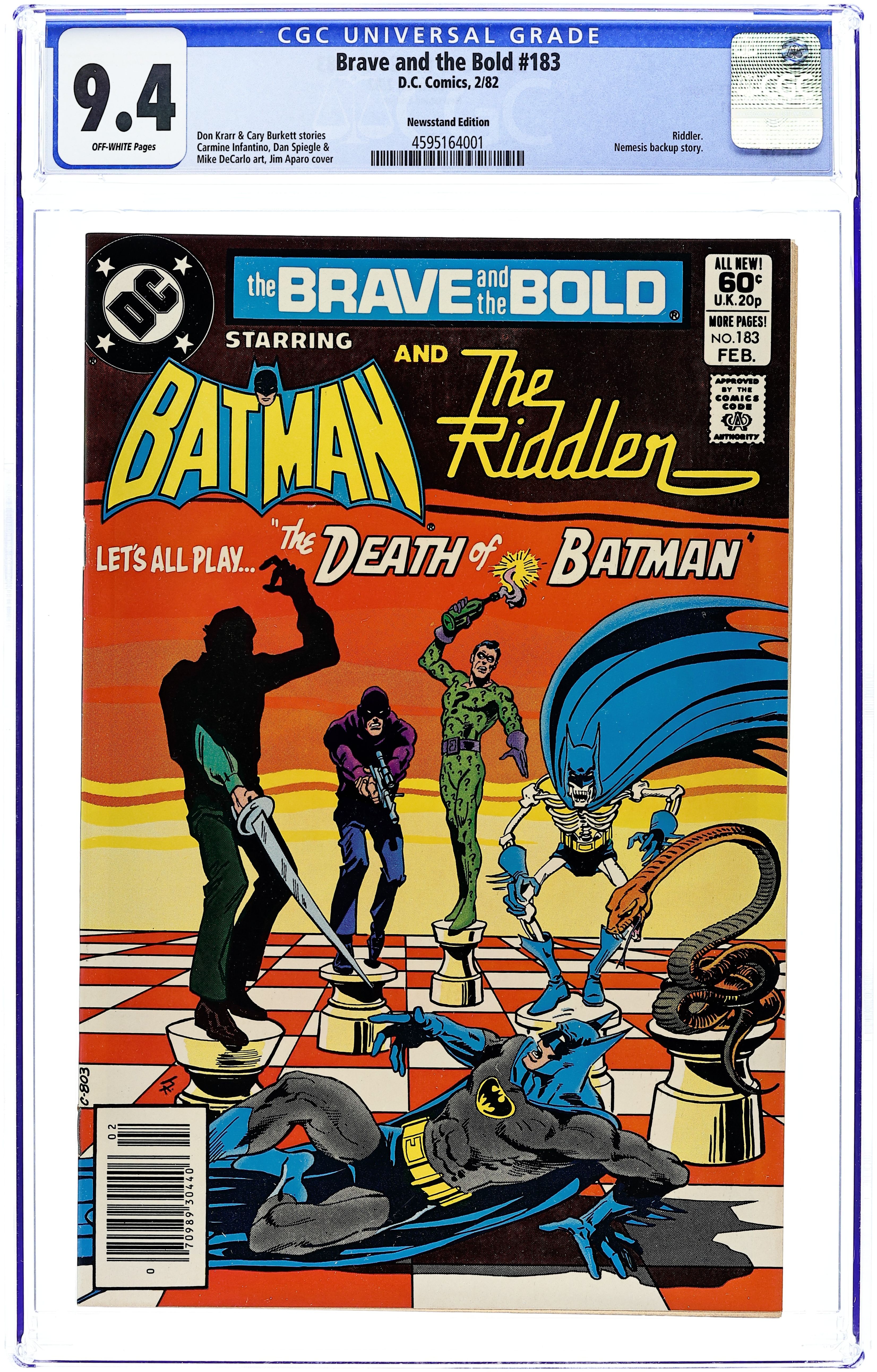 Newsstand Edition. Cover by Jim Aparo. "The Death of Batman," script by Don Kraar, pencils by Carmine Infantino, inks by Mike DeCarlo; Batman must play a deadly game against an unknown opponent, allegedly for the life of a famous mystery writer; His only ally: the Riddler. Marathon Madman Hostess Cup Cakes ad with the Flash. Back-up story: "Fox and Hounds!", script by Cary Burkett, art by Dan Spiegle; Greyfox tracks down Nemesis through his helicopter and sets a trap. 36 Pages, Full Color. Cover price $0.60.