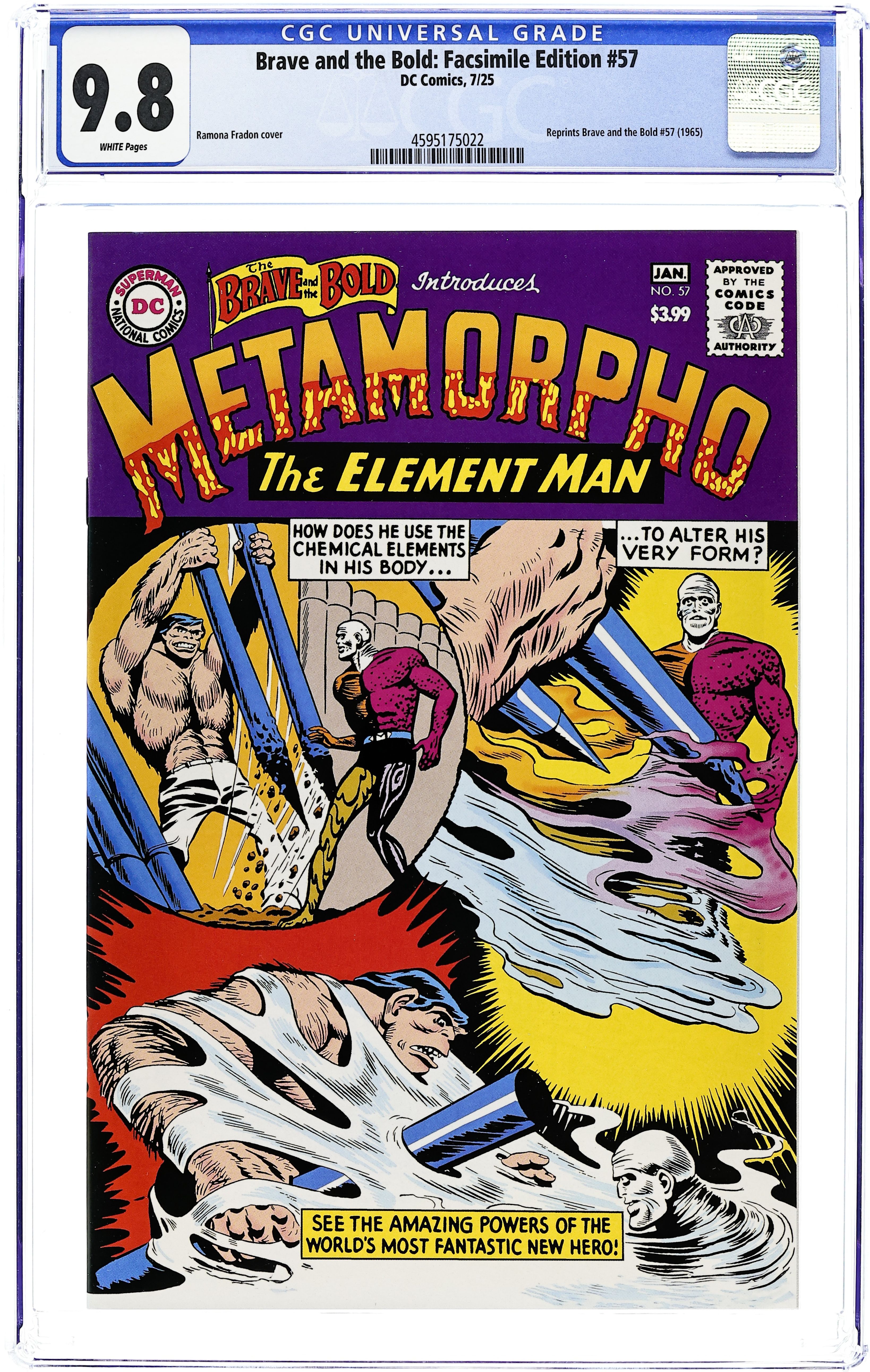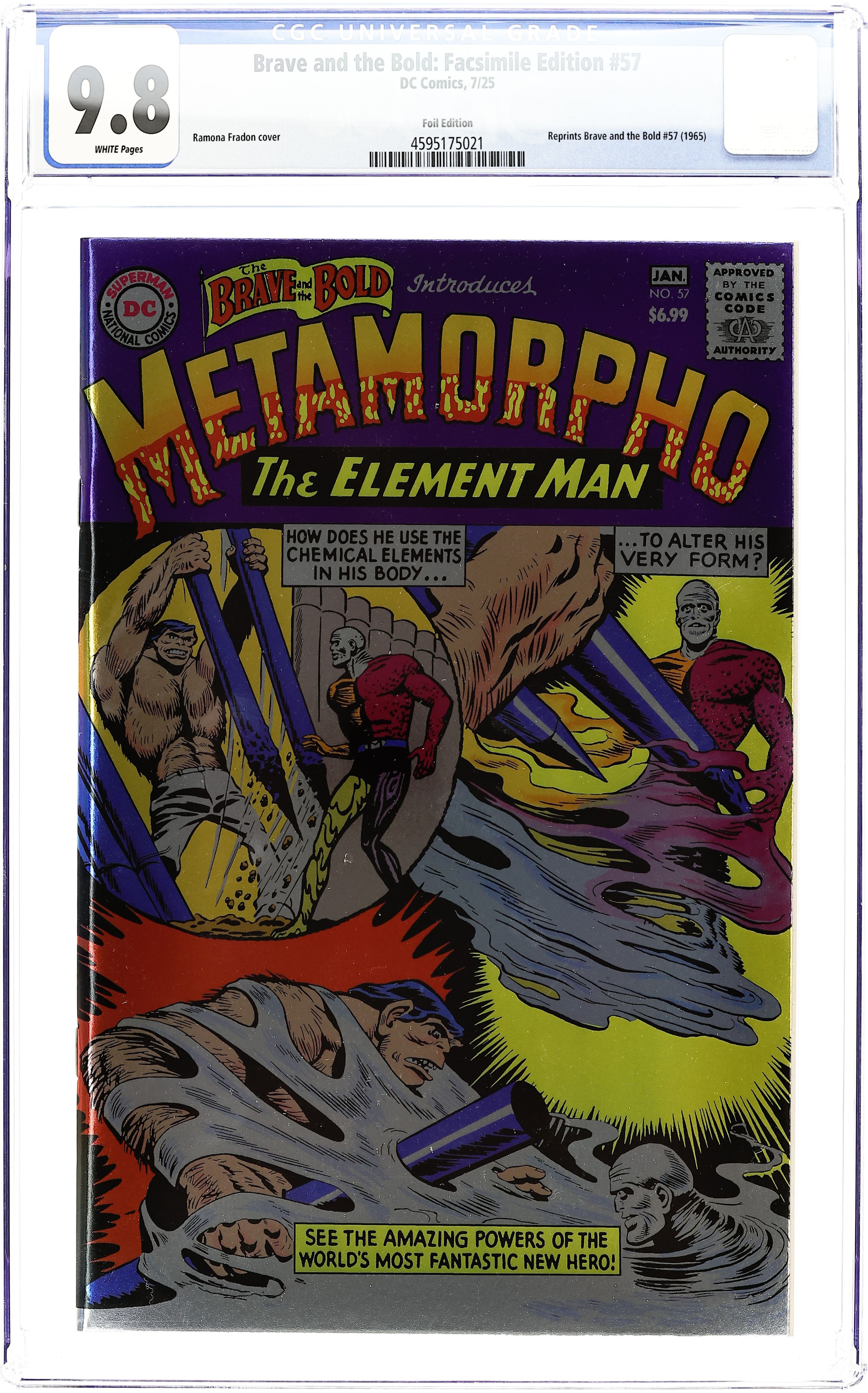 Foil Cover. Written by Bob Haney. Art by Ramona Fradon, Charles Paris. Cover by Ramona Fradon, Charles Paris. THE ORIGIN OF METAMORPHO! For daredevil soldier of fortune Rex Mason, one last job is all that stands between him and a life of happiness in the arms of the lovely Sapphire Stagg. But when his pouty paramour's ruthless father sends Rex to find the fabled Orb of Ra, he'll discover much more than anyone bargained for! Witness the creation of Metamorpho, the Element Man! 32 pages, full color. Rated T+ Cover price $6.99.