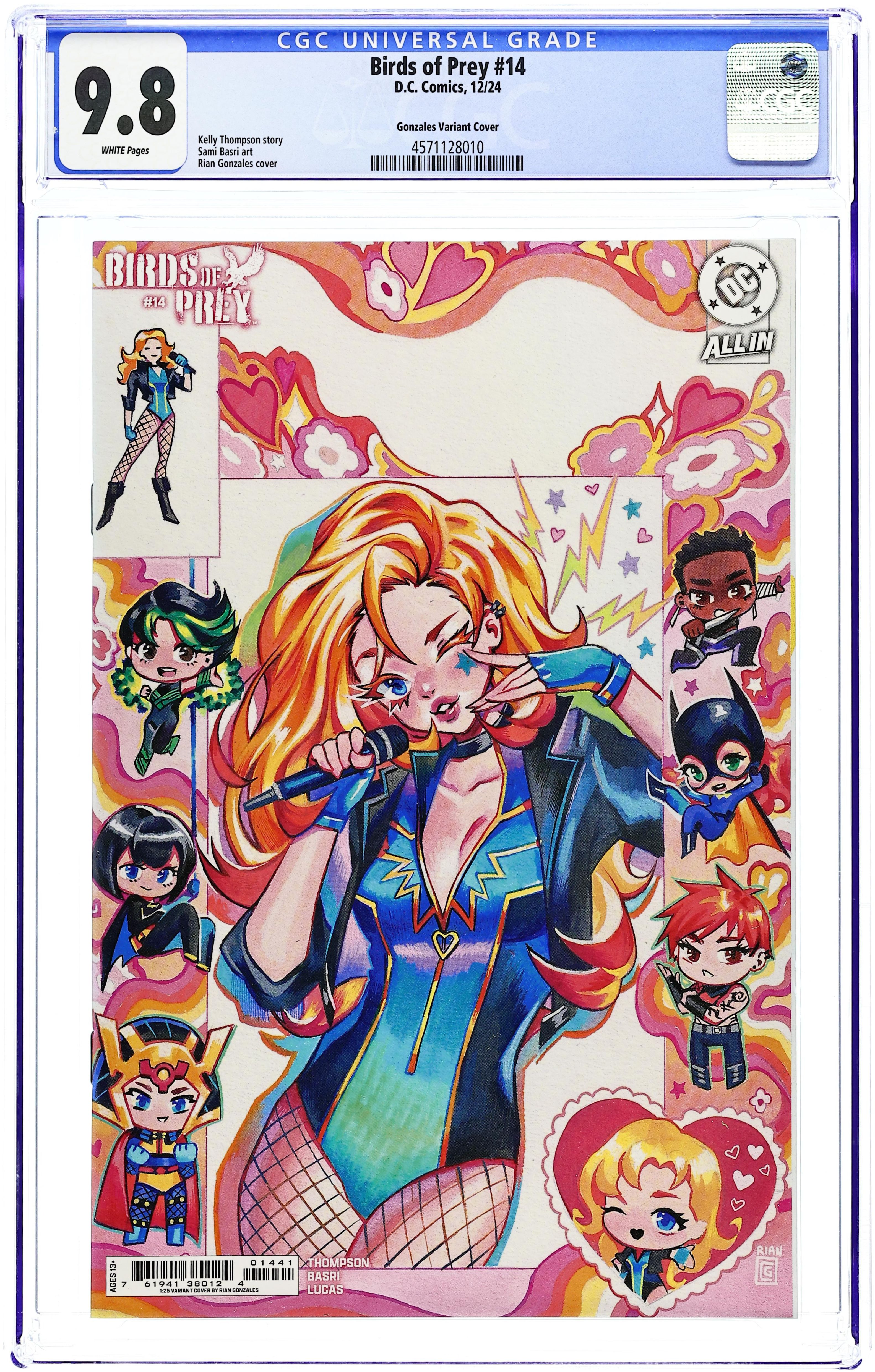 Limited 1 for 25 Retailer Incentive Variant Cover. Written by Kelly Thompson. Art by Sami Basri. Cover by Rian Gonzales. The Birds of Prey are back to business as they infiltrate The Ninth Day, a mysterious corporation the Birds believe has kidnapped people--including Amazons that have gone missing. When their spy on the inside, an undercover Cassandra Cain, breaks contact, it'll be up to Oracle, Black Canary, Big Barda, Megaera, and newcomers Grace Choi and Onyx to bust her out. Don't miss the start of this thrilling new arc, where the fate of the Amazons rests in the hands of a silent warrior! 32 pages, full color. Rated T+ Cover price $4.99.