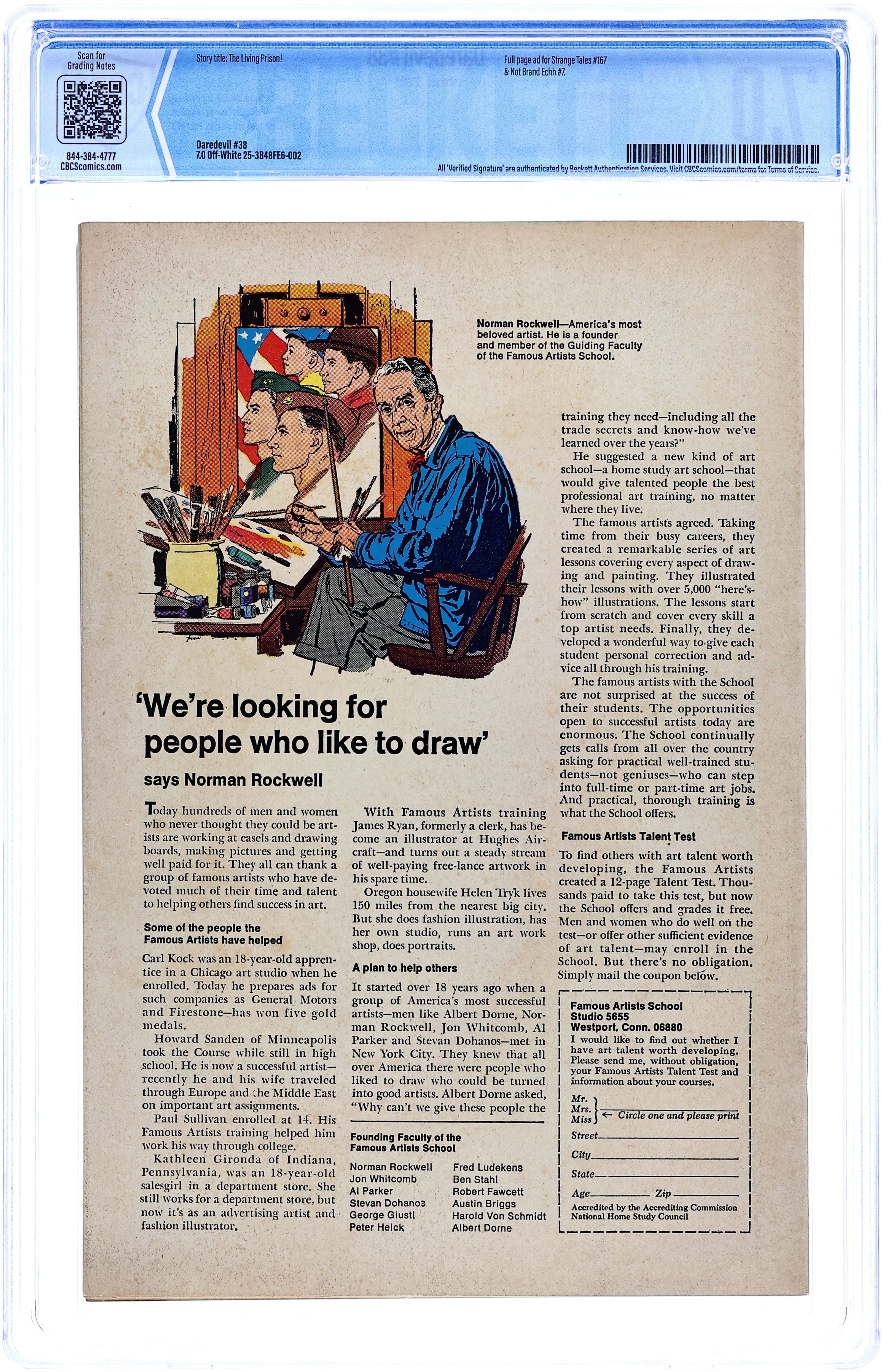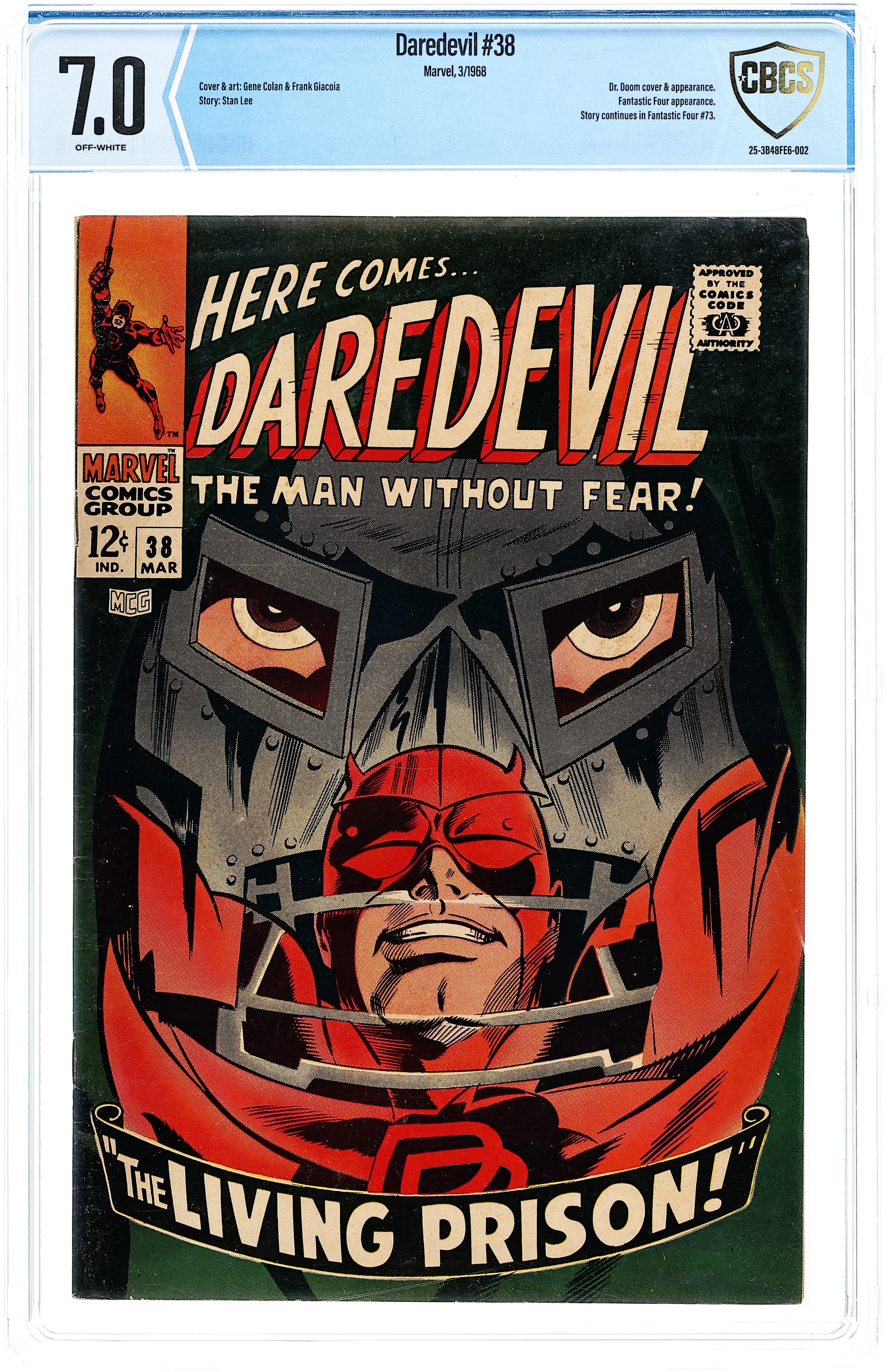 Cover pencils by Gene Colan, inks by Frank Giacoia. The Living Prison!, script by Stan Lee, pencils by Gene Colan, inks by Frank Giacoia; After a few battles and not a few episodes of identity confusion, Daredevil and Doctor Doom are reverted back to their original bodies, but the Fantastic Four doesn't know that; story continued in Fantastic Four #73. Letter to the editor from writer Peter Sanderson. 32 pgs. Cover price $0.12. Cover price $0.12.