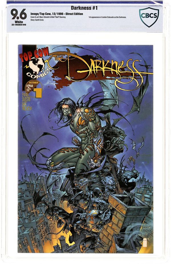 Variant blue cover. Cover pencils by Marc Silvestri, inks by Matt Banning (as Batt). "Coming Of Age," script by Garth Ennis, pencils by Marc Silvestri, inks by Matt Banning (as Batt); In New York City, Jackie Estacado is introduced as he stalks an undisclosed person for his "Uncle" Frankie Franchetti; The pair suspect that this man has been cheating the Franchetti Crime Family and decide on a whim that he would be better off dead; Jackie crushes the man with his sports car and shoots him several until he's dead; The Brotherhood of Darkness and a group of Angelus' warriors attack Jackie. "I Hope You've Enjoyed The Darkness" article by Marc Silvestri, pencils by Silvestri; Silvestri describes the making of the series. 36 pgs., full color. Cover price $2.50.