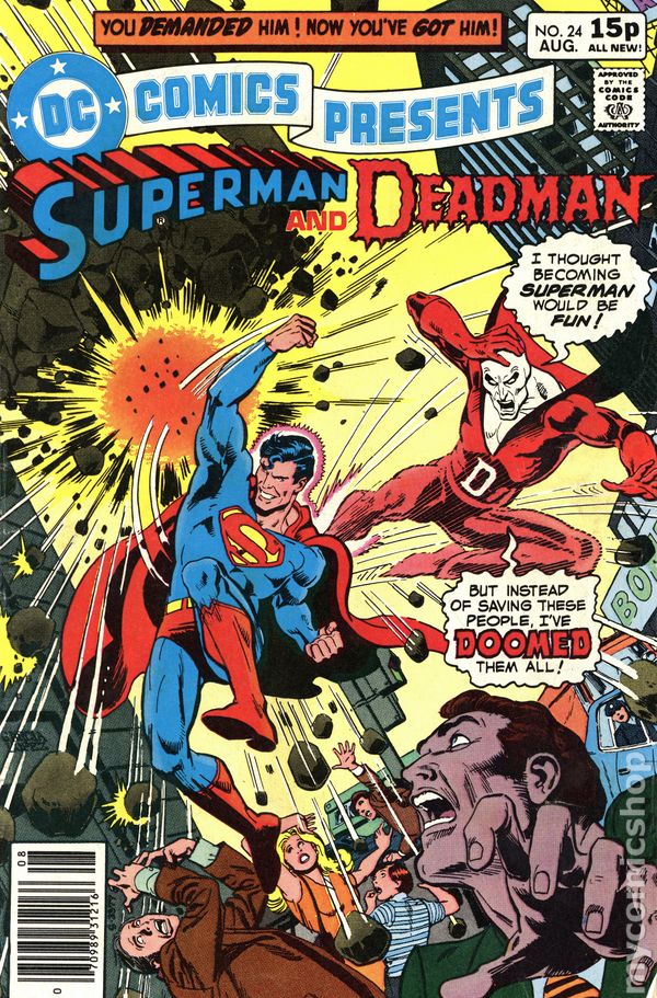 UK edition. Identical to US edition, but has 15p cover price. Superman and Deadman encounter a man whose heart is linked to the Earth itself, a link that's giving the planet a massive heart attack in "The Man Who Was the World!" Written by Len Wein. Art & cover by Jose Luis Garcia-Lopez. Last 40c cover-priced issue.