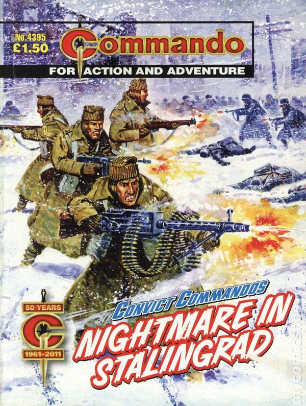 Convict Commandos: Nightmare in Stalingrad - Written by Alan Hebden. Art and Cover by Manuel Benet. Take a mission to a city under siege where two armies were locked in a battle to the death. Add in a sadistic and murderous NKVD officer and a mind-control device, powerful enough to turn any man into a fighting fury, and what do you have? Just another day at the office for the Convict Commandos! Weekly British War comics digest. Softcover, 5 1/2-in. x 6 1/2-in., 68 pages, B&W.