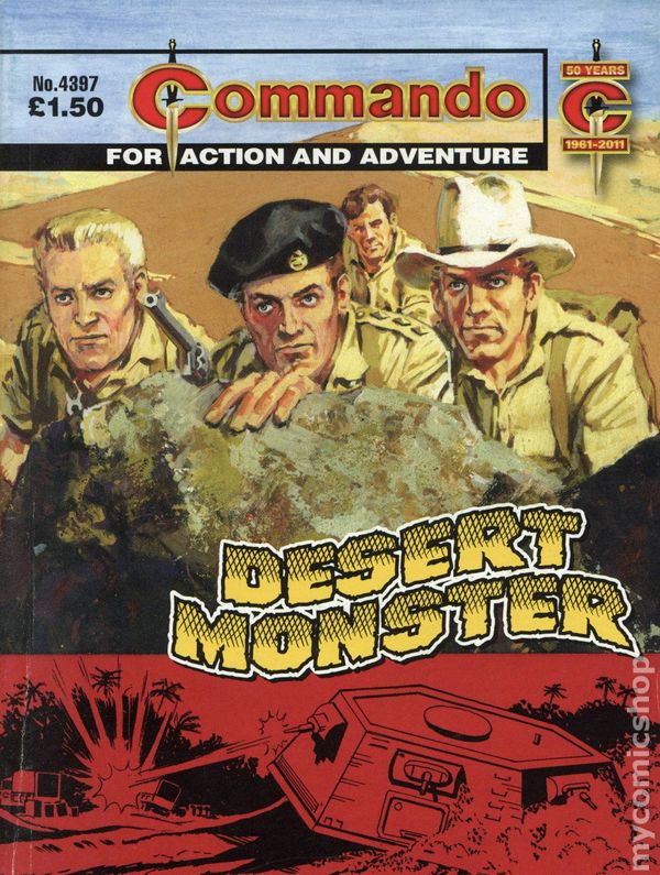Reprinting Commando War Stories in Pictures (1961 D. C. Thomson Digest) #298: Desert Monster - Written by Skentleberry. Art by Miguel Quesada. Cover by Lopez Espi. "No, Herr Hauptman, I have not been out in the sun too long. With my own eyes I saw it..it had six sides, as many guns as a pocket-battleship and moved like a great crab at about one hundred kilometres an hour. A tank? No, it wasn't a tank. It was more like a monster..." And after that report from a badly-frightened radio operator came into Nazi HQ, a wave of fear swept the desert. What was the Thing that struck from the shadows like a prehistoric beast? Only four men knew...and they were all listed as dead! Weekly British War comics digest. Softcover, 5 1/2-in. x 6 1/2-in., 68 pages, B&W.