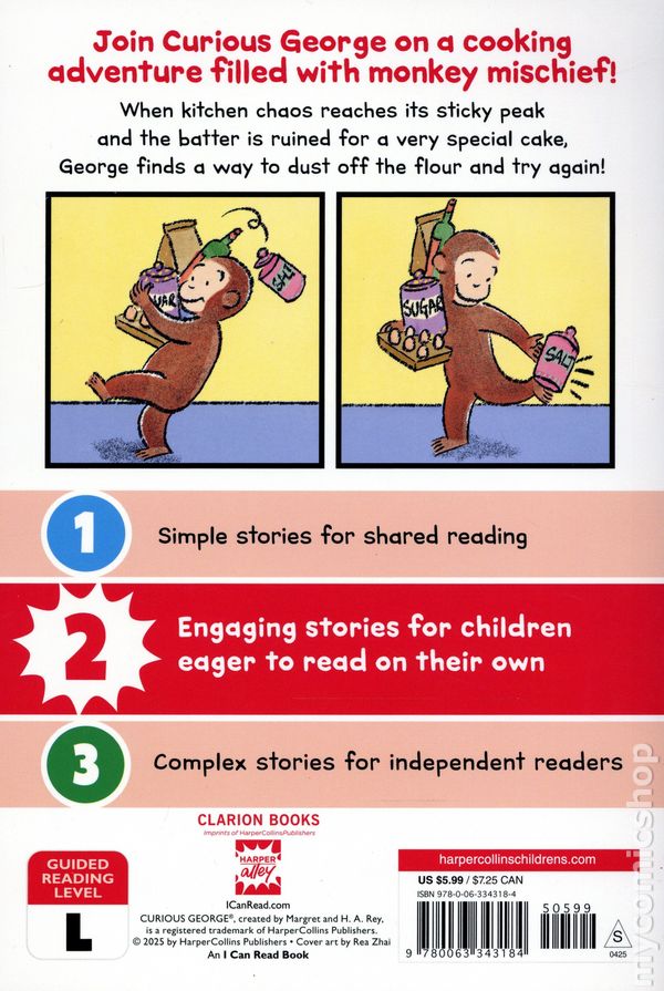 1st printing. Story and art by H A Rey. Join Curious George on this especially sweet I Can Read! Comics adventure as he gets up to monkey mischief in the kitchen while baking a special treat for his best friend! Softcover, 6-in. x 9-in., 32 pages, full color. All Ages Cover price $5.99.
