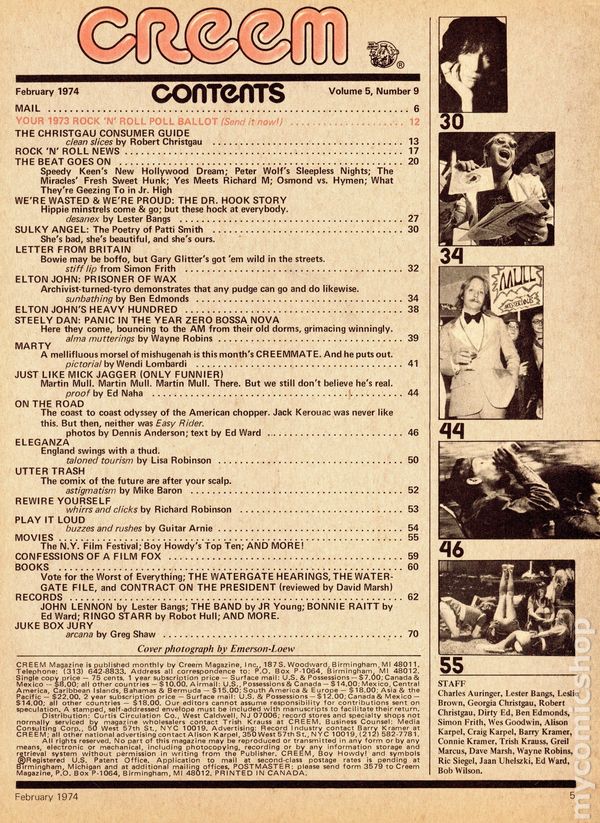 View scansRock music magazine noted for having been an early champion of various heavy metal, punk rock, new wave and alternative bands, especially bands based in Detroit. The term "punk rock" was coined in the May 1971 issue of Creem. 8.5" x 11", 84 pages, PB&W/PC. Cover price $0.75.