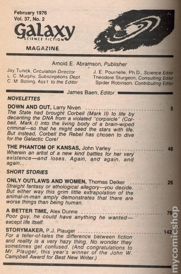 February 1976. Cover by Ames. Science fiction stories by Larry Niven, John Varley, Thomas Deiker, Alex Dunne, P. J. PLauger, Joanna Russ. Illustrations by Ames, Bramley, Fabian, Freff, Pini. 5-1/4-in. x 7-1/4-in.; b&w text with spot illustrations; 160 newsprint pages. Cover price $0.95.