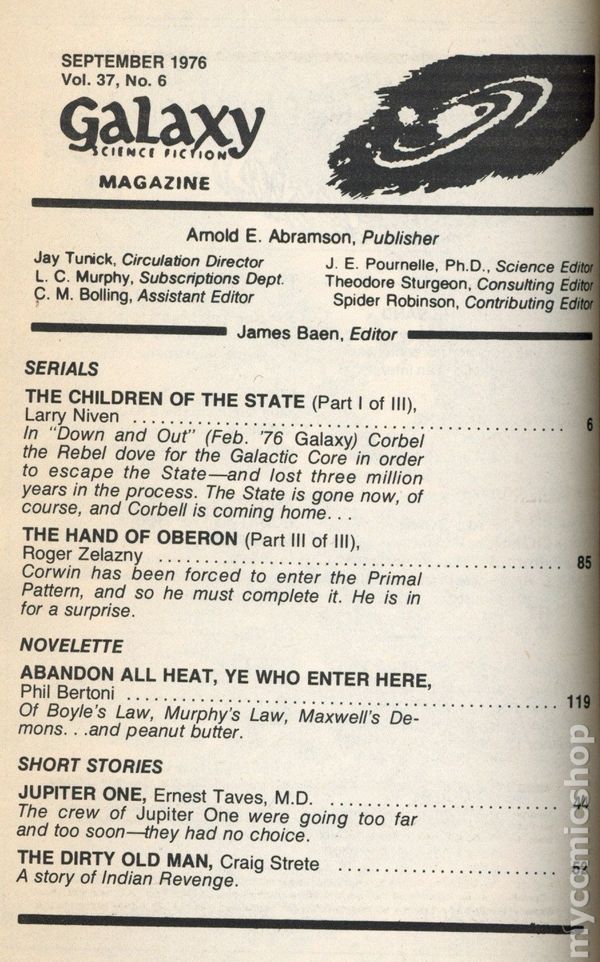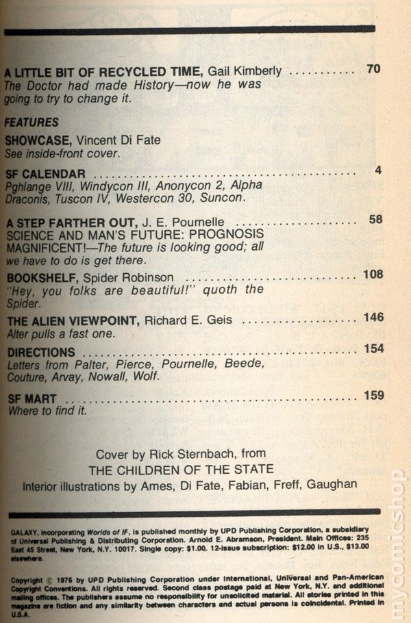 September 1976. Cover by Rick Sternbach. Science Fiction Stories: "The Children of the State" (Part 1 of 3) by Larry Niven, "The Hand of Oberon" (Part 3 of 3) by Roger Zelazny, "Abandon All Heat, Ye Who Enter Here" by Phil Bertoni, "Jupiter One" by Ernest Taves, M.D., "The Dirty Old Man" by Craig Strete, and "A Little Bit of Recycled Time" by Gail Kimberly. Interior Illustrations by Ames, Di Fate, Fabian, Freff, and Gaughan. Softcover Pulp Digest, 5-in x 7 1/2-in, 160 Pages, B&W. Cover price $1.00.