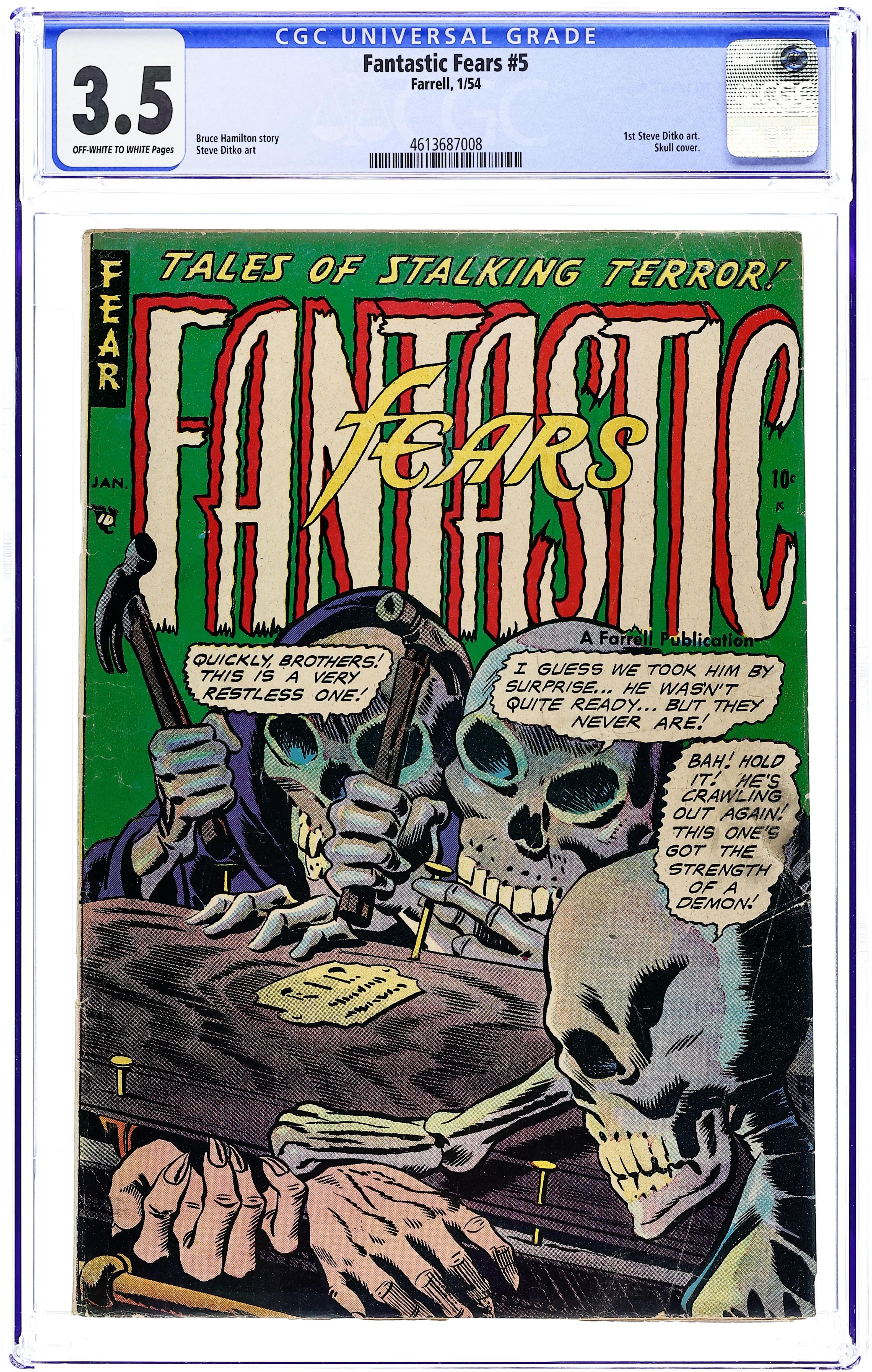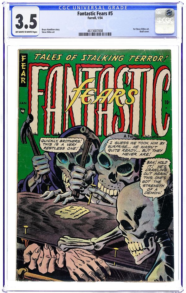 "My Coffin Must Wait"; Seth is informed that his wife Martha is dying; He vows to fulfill her last wish, driving her through a blizzard, defeating some bank robbers who want to hijack his car, and crashing through a police roadblock to reach town; Seth says he promised Martha she'd have her photograph taken one last time, and he gets Mr. Townsend to do it just before she dies. "Caught in the Graft"; Corrupt city official Sam is caught and sentenced to prison; Since he suffers from claustrophobia, Sam can't tolerate confinement; Working in the prison morgue, Sam learns the bodies are subsequently sent to the city morgue, a building constructed under his crooked supervision; Sam climbs into a coffin and escapes from prison. "Ghost Gift" text story; Dan finds his war comrade Don in Africa, now in possession of a valuable jewel mine. "Stretching Things," script by Bruce Hamilton, art by Steve Ditko; Dawson suffers from brittle bone syndrome, but Dr. Doyle invents "muiclac" to cure him; He discovers this makes him "elastic" and murders Doyle to keep his secret. "Escape from Hell!"; Criminal Richard Benton dies and goes to Hell; He's sentenced by Satan to drag a boulder around for eternity; Benton struggles to climb a mountain to freedom, plagued by demons and hindered by the boulder, only to learn "there is no escape from Hell!" "Temple of the Beast"; In Siam, American tourists Sam and Anne buy "the hand of Sivak," a local god; The vendor later buys it back from Sam but the hand comes alive and strangles him; Anne recovers the hand and mails it to the USA. 36 pgs., full color. Cover price $0.10.