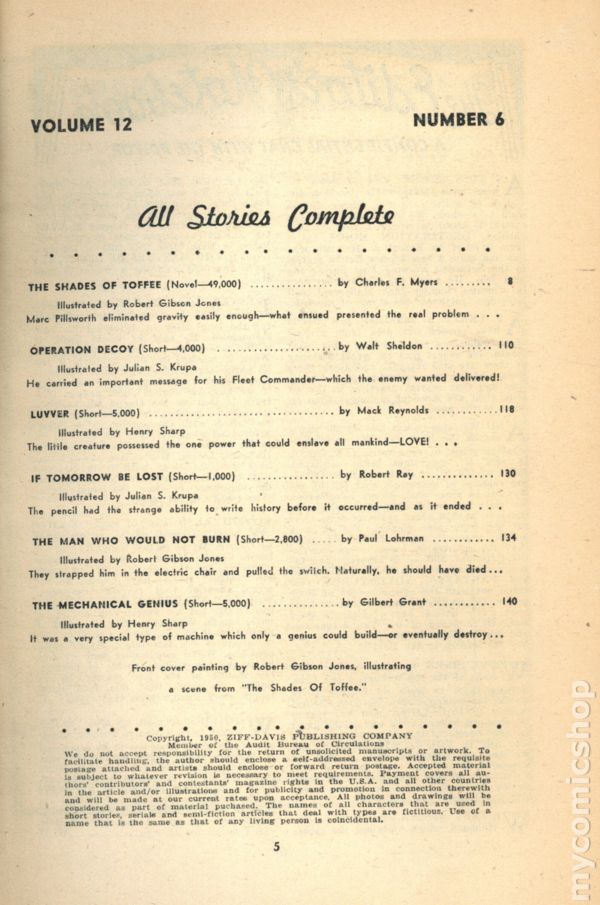 Volume 12, Issue 6 - June, 1950. Cover by Robert Gibson Jones. Science Fiction and Adventures stories. This issue features "The Shades of Toffee" by Charles F. Myers. Softcover Pulp, 7-in x 10-in, 164 Pages, B&W. Cover price $0.25.