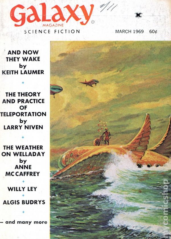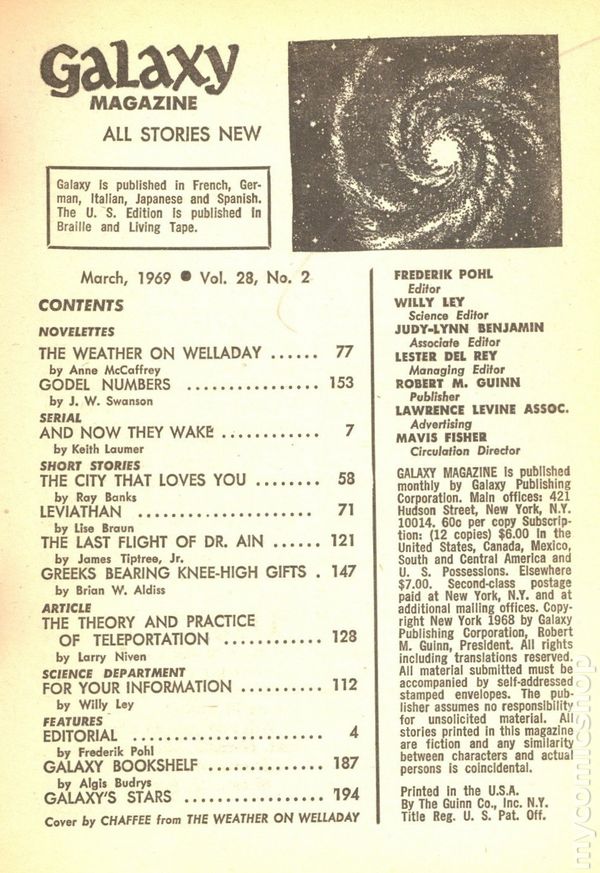 View scansMarch 1969. Cover by Douglas Chaffee. Stories: "The Weather On Welladay" by Anne McCaffrey, "Godel Numbers" by J.W. Swanson, "And Now They Wake" (Part 1 of 3) by Keith Laumer, "The City That Loves You" by Ray Banks, "Leviathan" by Lise Braun, "The Last Flight of Dr. Ain" by James Tiptree, Jr., "Greeks Bearing Knee-High Gifts" by Brian W. Aldiss. Article: "The Theory and Practice of Teleportation" by Larry Niven. Illustrations by Jack Gaughan and Reese. Softcover Pulp Digest, 5-in. x 7-in.;194 Pages, B&W. Cover price $0.60.