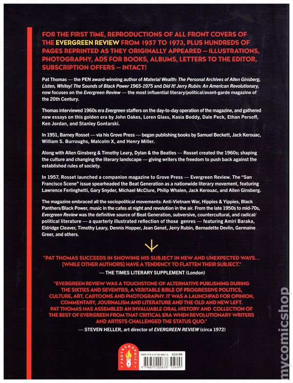 1st printing. Written by Pat Thomas. From the late 1950s to the mid-70s, work by contributors like Allen Ginsberg, William Burroughs, Amiri Baraka, Eldridge Cleaver, Tim Leary, Dennis Hopper, Jean Genet, Jerry Rubin, Bernadette Devlin, and Germaine Greer regularly appeared in the countercultural magazine Evergreen Review. Their subversive work and radical politics defined outsider literature for an entire generation. Edited by Barney Rosset of Grove Press, Evergreen Review was a quarterly illustrated/photography driven reflection of that genre. For the first time ever since their original print date, full color reproductions of all front covers of all 100 issues of the Evergreen Review from 1957 to 1973, plus hundreds of pages from many of the issues are reprinted exactly as they looked then – with all illustrations, photography, even the ads for other books, albums, letters to the editor, subscription offers, etc. – left intact! Historian Pat Thomas interviewed original 1960s era Evergreen staffers to get the inside scoop on the day-to-day operation of the magazine, and those conversations join new essays looking back on this golden era by John Oakes, Loren Glass, Kasia Boddy, Dale Peck, Ethan Persoff, Ken Jordan and Stanley Gontarski. Will this new Evergreen Review change the world as it did in the 1960s? Of course it will! Hardcover, 9-in. x 12-in., 320 pages, full color. Cover price $34.99.