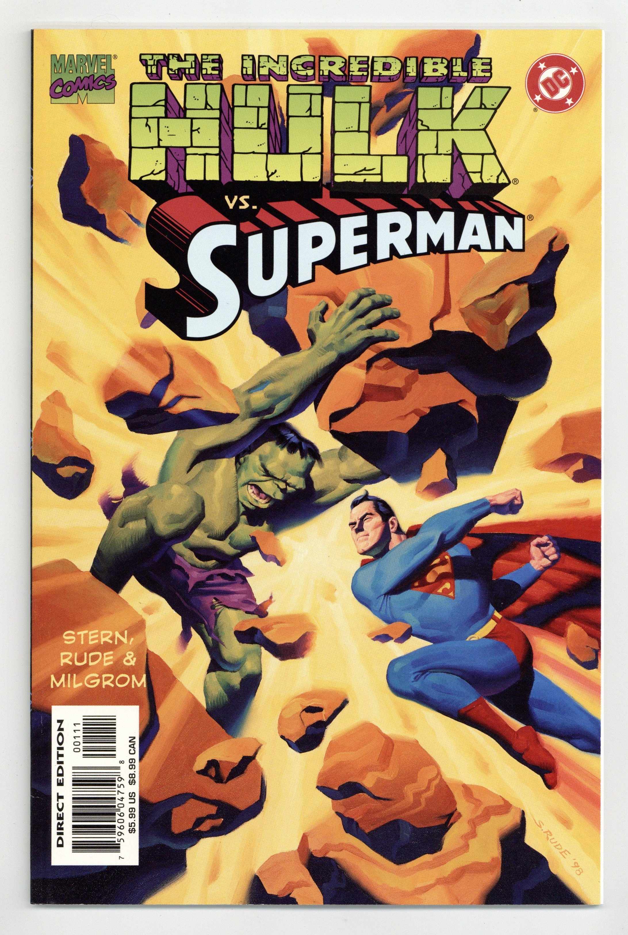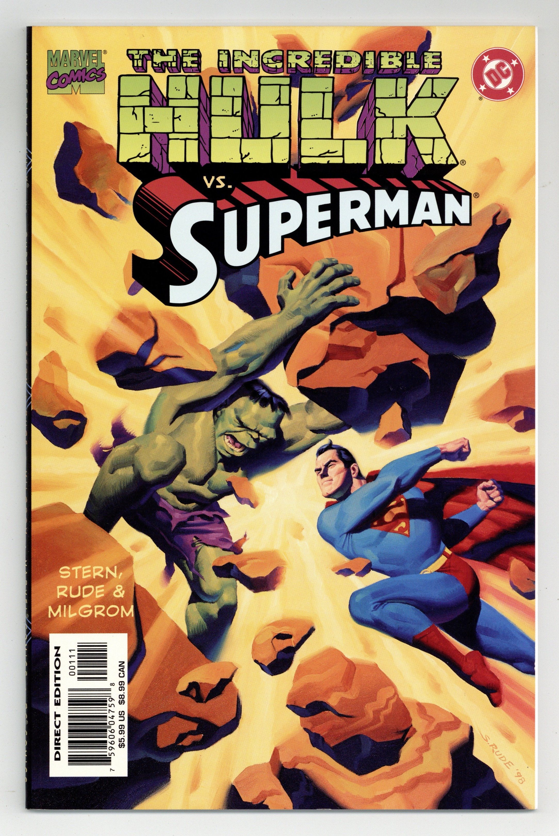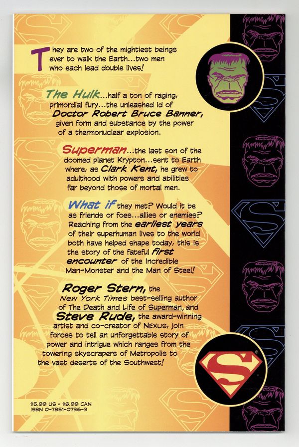 "Double Lives!" Story by Roger Stern. Art by Steve Rude and Al Milgrom. One is half a ton of primordial rage and fury and the product of modern science. The other is the last son of the doomed planet Krypton and endowed with abilities far beyond those of mortal men. Rendered in nostalgic 1950's-style artwork, this book tells the tale of "What if these two met?" What if these comic book icons had been born under the same banner? What will happen when the man-monster known as the Hulk, the strongest one there is, meets Superman, the Man of Steel and perhaps the greatest superhero of them all? Cover price $5.99.