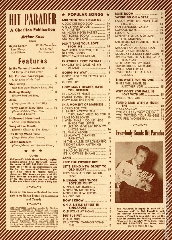 Rita Hayworth cover. Song lyrics, short gossip articles and period photographs. Long running music magazine featuring articles, song lyrics and fan letters. 8 1/2-in. x 11-in., 20 pages, B&W Cover price $0.10.