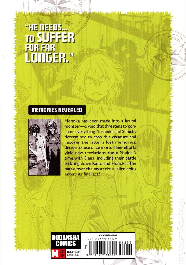 Honoka has been made into a brutal monster—a void that threatens to consume everything. Yoshioka and Shuichi, determined to stop this creature and recover the latters lost memories, decide to fuse once more. Their efforts yield new revelations about Shuichis time with Elena, including their battle to bring down Kaito and Honoka. The battle over the mysterious, alien coins enters its final act!