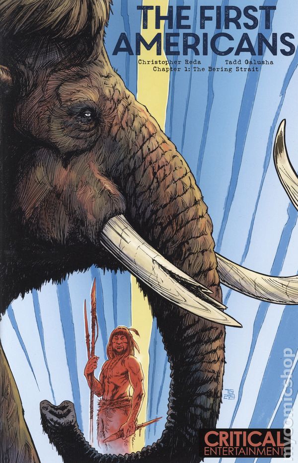 Written by Christopher Reda. Art and Cover by Tadd Galusha. At the end of the Ice Age 14,000 years ago and on the verge of starvation, a tribe of Paleo-Indians travel across across the Bering Land Bridge from Siberia into North America to hunt an elusive pack of mammoths; but when they fail to hunt down the beasts, the tribe must adapt to their new surroundings before becoming extinct in this new land. 44 pages, full color. Rated M Cover price $4.99.