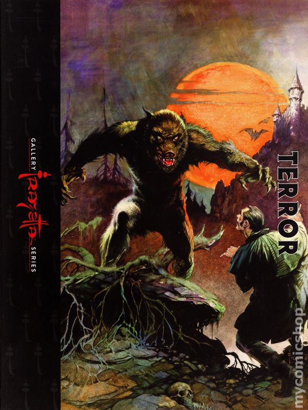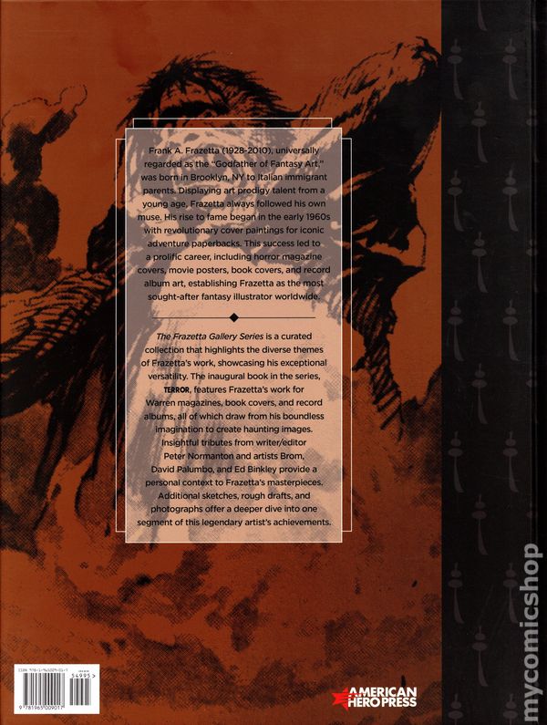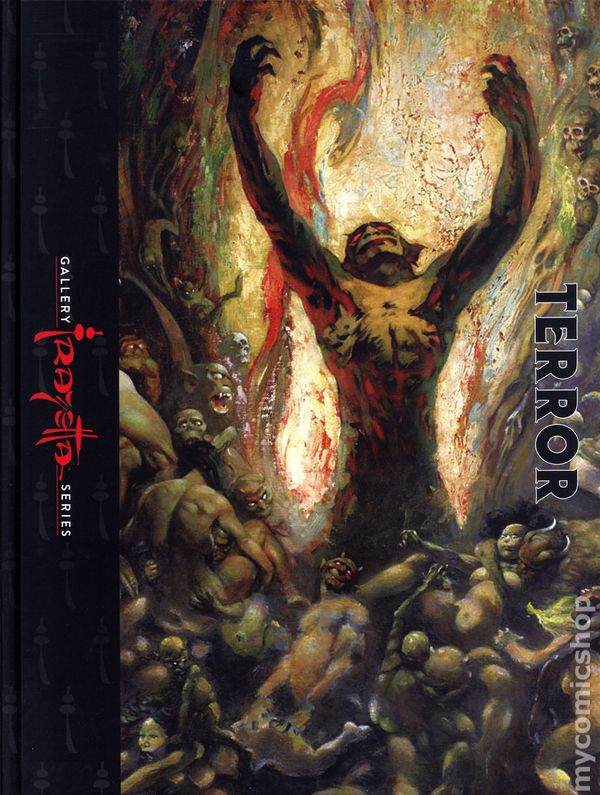 1st printing. Text by Peter Normanton, Brom, David Palumbo, Ed Binkley, and Frankie Frazetta. Art and cover by Frank Frazetta. The Terror volume of the Frazetta Gallery Series includes 60s-70s horror magazine paintings, paperback and hardcover paintings showcasing your favorite nightmares! 72 interior pages plus covers and endsheets11.25 x 15 trim size. Full color covers plus foil stamping. Printed on heavyweight 200gsm art board, bound in ultra-weight 3mm boards. Luxurious 3-piece case binding. 25 Carefully chosen paintings printed one to a page (includes the paintings from the softcover and additional rare pieces). Hardcover, 11 1/2-in. x 15-in., 72 pages, full color. Teen Cover price $49.95.