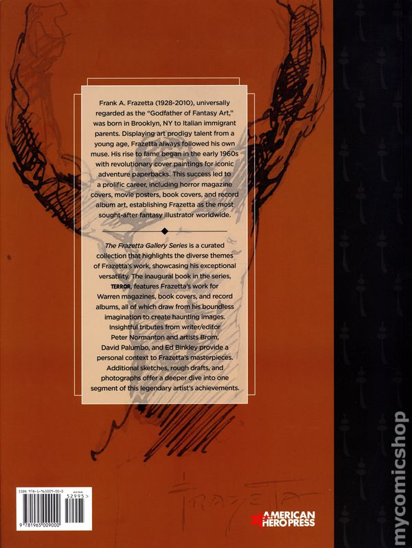 1st printing. Text by Peter Normanton, Brom, David Palumbo, Ed Binkley, and Frankie Frazetta. Art and cover by Frank Frazetta. The Terror volume of the Frazetta Gallery Series includes 60s-70s horror magazine paintings, paperback and hardcover paintings showcasing your favorite nightmares! (Softcover edition, 56 pages, showing 2-color printed inside covers bonus) $29.9556 interior pages plus covers. 11.25 x 15 trim size. Full color covers with French flaps. Printed on heavyweight 200gsm art board, covers on premium 300 gsm art board. 21 Carefully chosen paintings printed one to a page. Additional sketches, prelims and Frazetta photos throughout. Foreword by Frankie Frazetta. Appreciations/essays by Peter Normanton and Brom. Easily removable prints for hanging. Softcover, 11 1/2-in. x 15-in., 56 pages, full color. Teen Cover price $29.95.