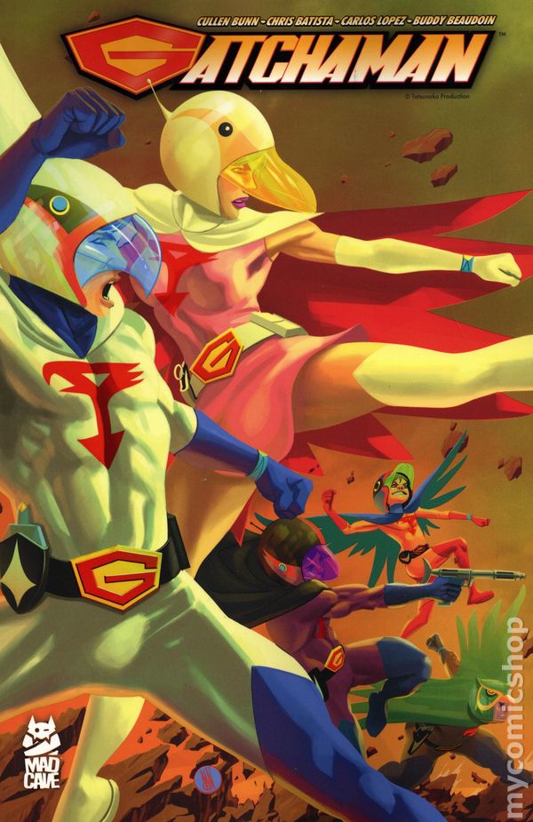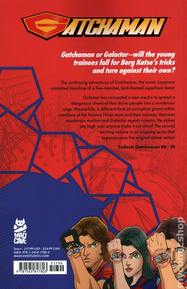 Volume 2 - 1st printing. Collects Gatchaman (2024 Mad Cave) #6-10. Written by Cullen Bunn. Art by Chris Batista, Sabrina Cintron, and Pasquale Qualano. Cover by Inaki Miranda. Back Cover by Chris Batista. Galactor has concocted a new mecha to spread a dangerous chemical that drives people into a murderous rage. Meanwhile, a different form of corruption grows within members of the Science Ninja team and their trainees. Between murderous mechas and Galactor agents aplenty, the stakes are high--can anyone make it out alive? The second exciting volume in an ongoing series that expands upon the original anime! Softcover, 128 pages, full color. Teen+ Cover price $17.99.
