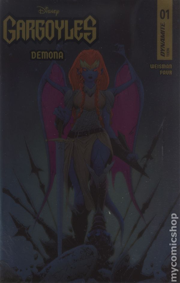 Virgin Foil Cover. Written by Greg Weisman. Art by Frank Paur. Cover by Mark Spears. A THOUSAND YEARS OF ADVENTURE BEGINS HERE! After kicking off with a special prologue story in Dynamite Entertainment's Free Comic Book Day issue #0, the long-awaited tale of Goliath's former love and sworn enemy of the Manhattan Clan gets underway in earnest with a return to the Dark Ages and the aftermath of the destruction of Castle Wyvern! The year is 1093, and the now-immortal Demona has become a lonely and hunted creature. Bereft of both clan and home after her betrayal of Scotland's king, she wanders south to Northumberland in search of a safe haven - only to find that her old nemesis, Canmore, is raiding the city. Canmore's destruction is visited upon human and Gargoyle alike, and when she discovers the depths of his cruelty and the fate of her kind at his hands, Demona's fury sets in motion a cycle of vengeance that will last for centuries - and may yet consume the entire world! 32 pages, full color. Rated T Cover price $29.99.