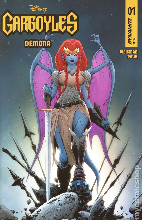 Written by Greg Weisman. Art by Frank Paur. Cover by Mark Spears. A THOUSAND YEARS OF ADVENTURE BEGINS HERE! After kicking off with a special prologue story in Dynamite Entertainment's Free Comic Book Day issue #0, the long-awaited tale of Goliath's former love and sworn enemy of the Manhattan Clan gets underway in earnest with a return to the Dark Ages and the aftermath of the destruction of Castle Wyvern! The year is 1093, and the now-immortal Demona has become a lonely and hunted creature. Bereft of both clan and home after her betrayal of Scotland's king, she wanders south to Northumberland in search of a safe haven - only to find that her old nemesis, Canmore, is raiding the city. Canmore's destruction is visited upon human and Gargoyle alike, and when she discovers the depths of his cruelty and the fate of her kind at his hands, Demona's fury sets in motion a cycle of vengeance that will last for centuries - and may yet consume the entire world! 32 pages, full color. Rated T Cover price $4.99.