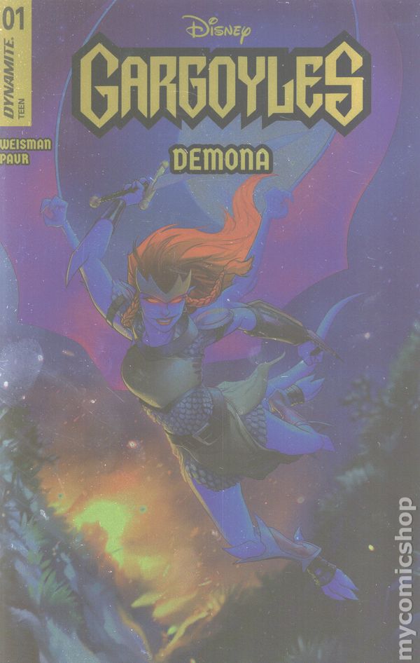 Virgin Foil Cover. Written by Greg Weisman. Art by Frank Paur. Cover by Meghan Hetrick. A THOUSAND YEARS OF ADVENTURE BEGINS HERE! After kicking off with a special prologue story in Dynamite Entertainment's Free Comic Book Day issue #0, the long-awaited tale of Goliath's former love and sworn enemy of the Manhattan Clan gets underway in earnest with a return to the Dark Ages and the aftermath of the destruction of Castle Wyvern! The year is 1093, and the now-immortal Demona has become a lonely and hunted creature. Bereft of both clan and home after her betrayal of Scotland's king, she wanders south to Northumberland in search of a safe haven - only to find that her old nemesis, Canmore, is raiding the city. Canmore's destruction is visited upon human and Gargoyle alike, and when she discovers the depths of his cruelty and the fate of her kind at his hands, Demona's fury sets in motion a cycle of vengeance that will last for centuries - and may yet consume the entire world! 32 pages, full color. Rated T Cover price $29.99.