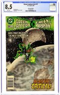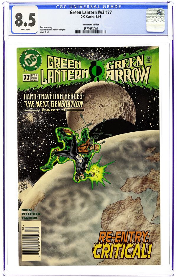 Newsstand Edition. Hard-Traveling Heroes: The Next Generation. Part 3 of 4. "Re-Entry: Critical!" Guest-starring Green Arrow (Connor Hawke). Story by Ron Marz. Art by Paul Pelletier and Romeo Tanghal. Story continued from Green Arrow (1987-1998 1st Series) #110. Kyle's father asks the Green Lantern for a favor. But it is a favor that will set Green Lantern against his friend, Green Arrow. Story concludes in Green Arrow (1987-1998 1st Series) #111. Cover price $1.75.
