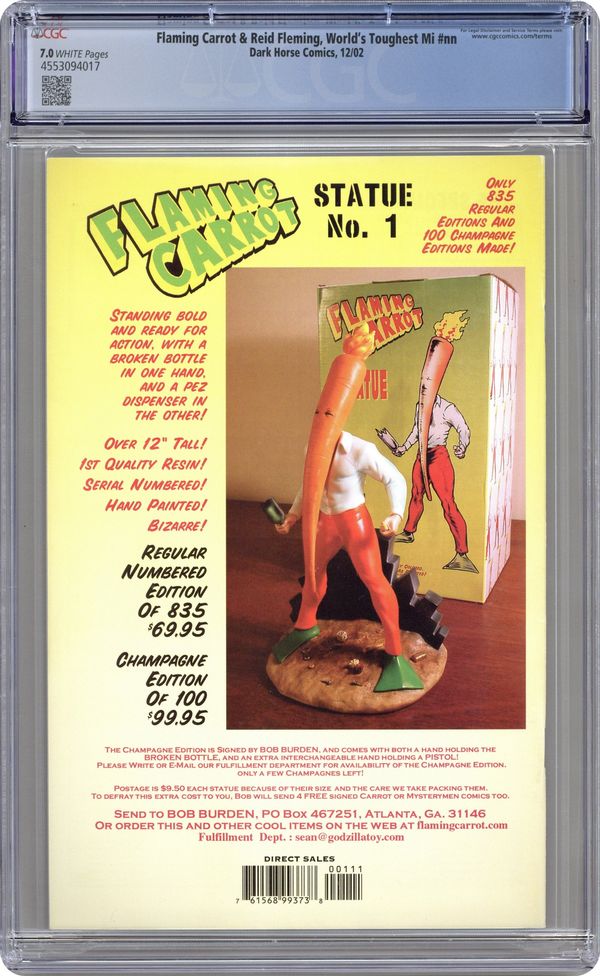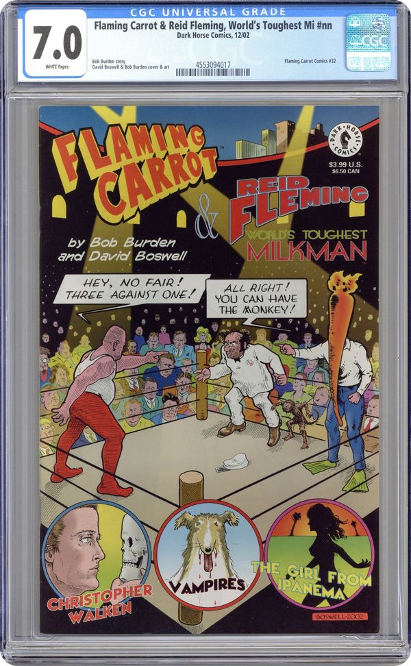 created by BOB BURDEN & DAVID BOSWELL written by BOB BURDEN; illustrated by DAVID BOSWELL & BOB BURDEN Come take a spin in the sturdiest, dirtiest milk truck you've ever seen, as Flaming Carrot, Iron City crime fighter and founding member of the Mysterymen, and the World's Toughest Milkman, Reid Fleming, roll right through the traffic jam that is popular culture. Whether it's going toe-to-toe with the unholy trinity of Fabio, Pavarotti, and Christopher Walken on the TV game show Celebrity Standoff, or pillaging the vaults of the Major Motion Picture movie studios, Fleming and the Carrot find more than their share of high jinks and mayhem on their madcap journey of comedy and cognitive dissonance. See, you're getting smarter already! On Sale December 26 SC, 32pg, b&w . . . . . . . . . . . . . . . $3.99 Cover price $3.99.