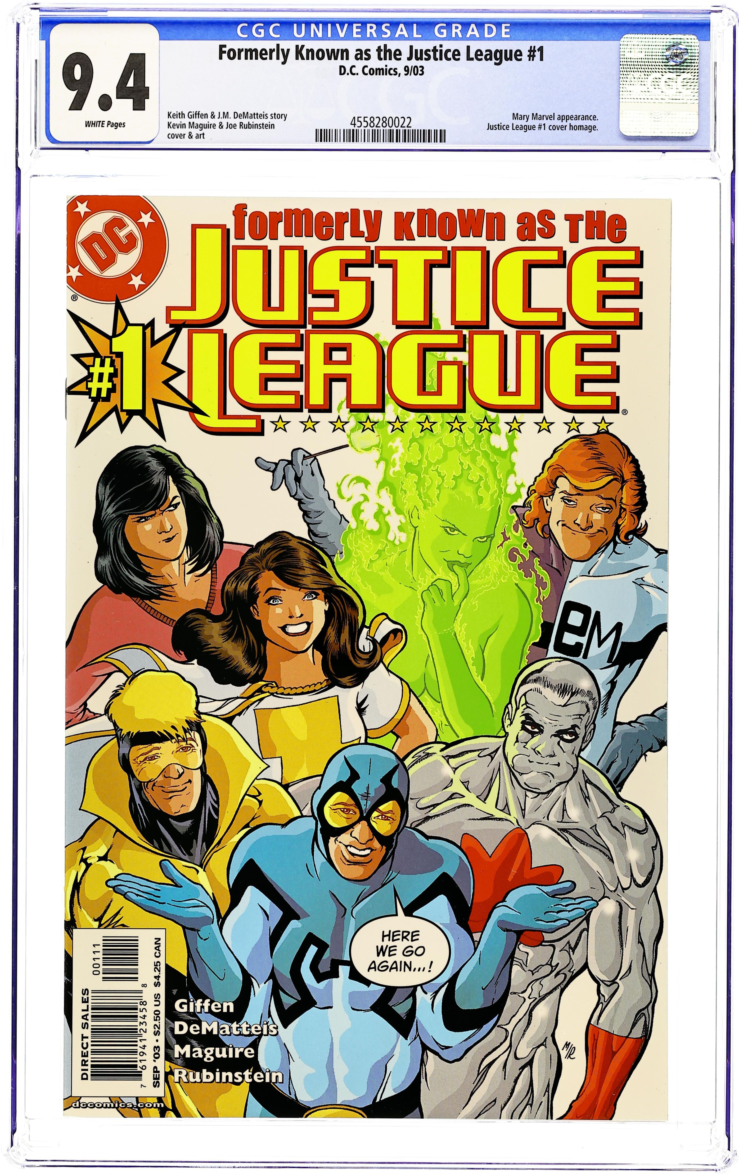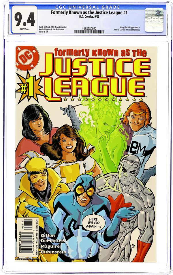 WRITTEN BY KEITH GIFFEN AND J.M. DEMATTEIS; ART AND COVER BY KEVIN MAGUIRE AND JOE RUBINSTEIN In stores July 2. Reuniting the creative team behind the classic '80s JUSTICE LEAGUE! Maxwell Lord tries to base a super-team-for-hire in a suburban strip mall, but his plan is met with hostility by the locals. Can reluctant heroes Blue Beetle, Booster Gold, Fire, Elongated Man, Captain Atom and Mary Marvel convince Max to stop the madness? (1 OF 6) $2.50 Cover price $2.50.
